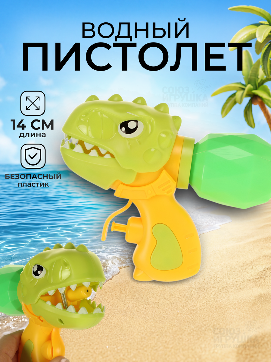 Водный пистолет-динозавр 14,3см, зелёный/жёлтый, пластик, для активных игр
