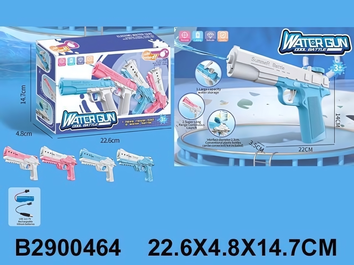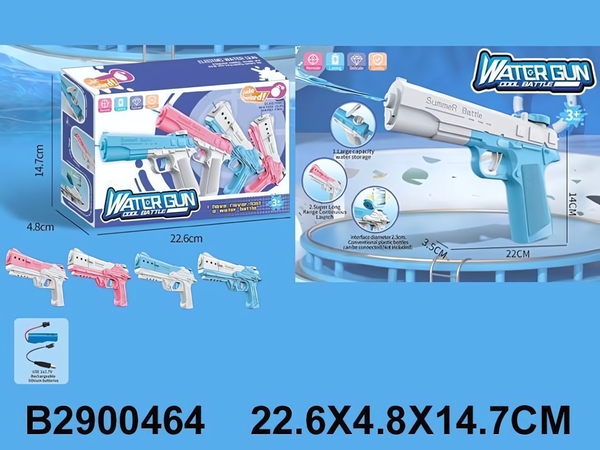 Водный пистолет имеет удобную эргономичную рукоятку, что делает его простым в использовании даже для самых маленьких. Он работает от аккумулятора, который можно зарядить через USB, что обеспечивает долгую игру без необходимости постоянной замены батареек. Пистолет подходит для детей от 3 лет, что делает его безопасным и доступным для самых юных пользователей.