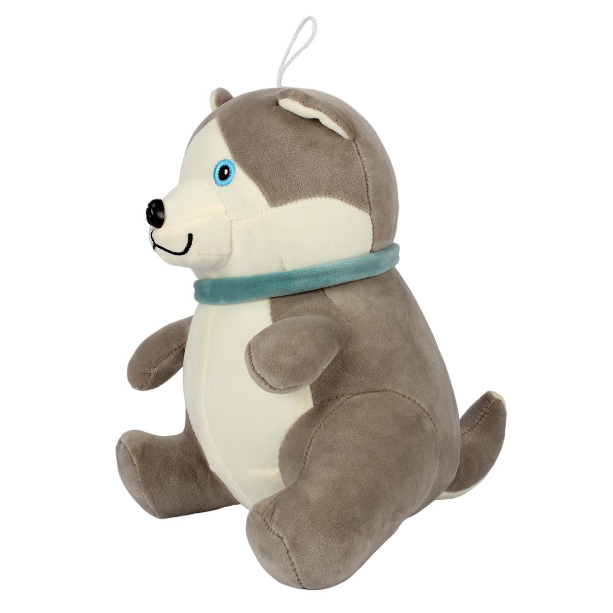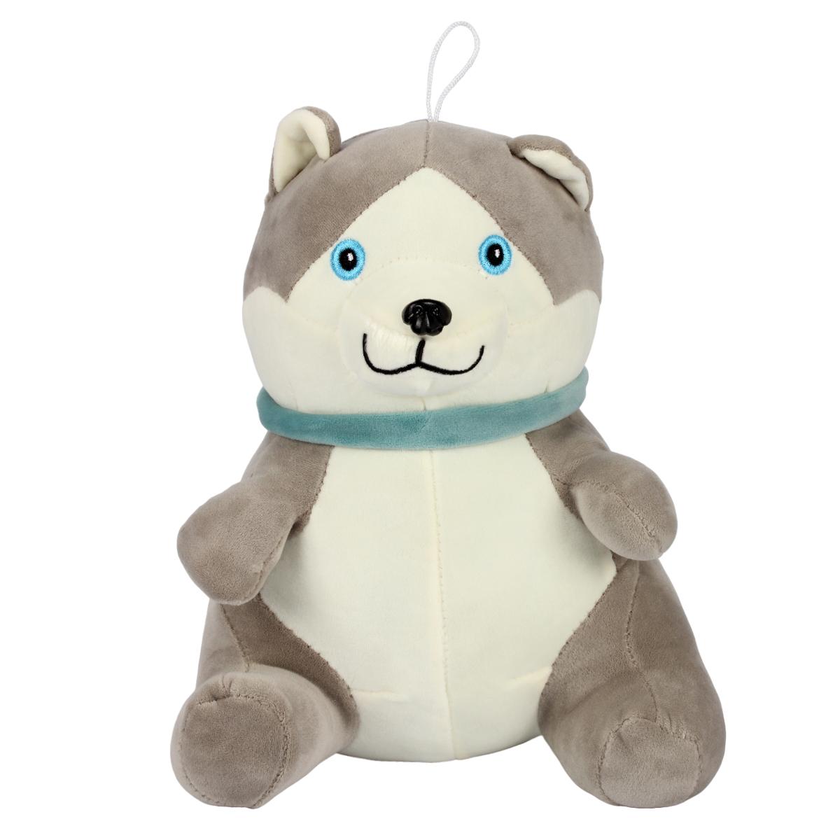 Игрушка изготовлена из мягкого плюша, который сохраняет форму даже после многочисленных стирок. Серо-белый цвет сочетается с голубым шарфом, создавая стильный образ. Все детали прочно пришиты, что гарантирует долговечность даже при активном использовании.
