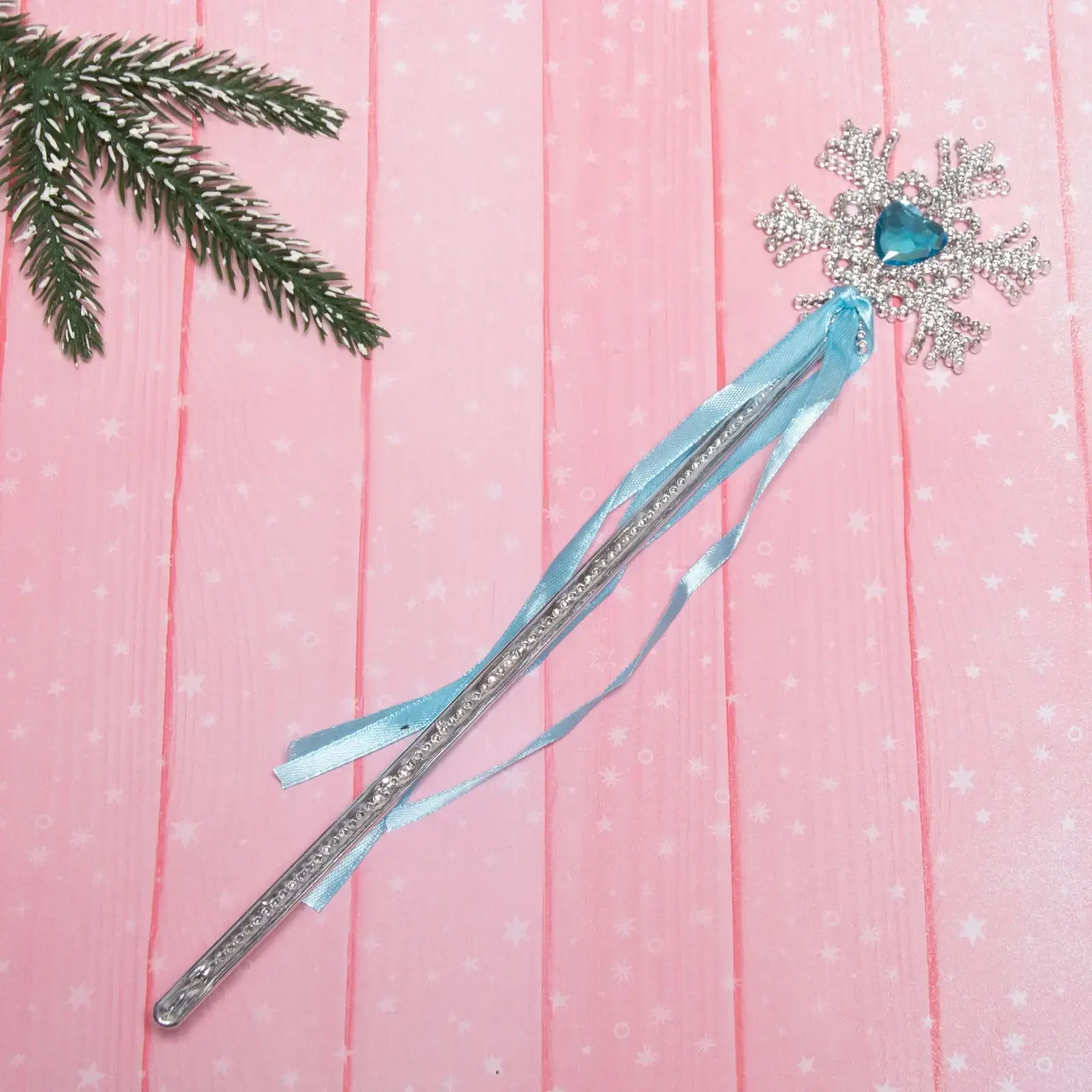Серебристая палочка со снежинкой и голубыми лентами станет изюминкой новогоднего декора. Идеальный аксессуар для фотосессий, детских утренников и украшения интерьера. Блестящая поверхность и мерцающие элементы создают эффект зимнего волшебства.