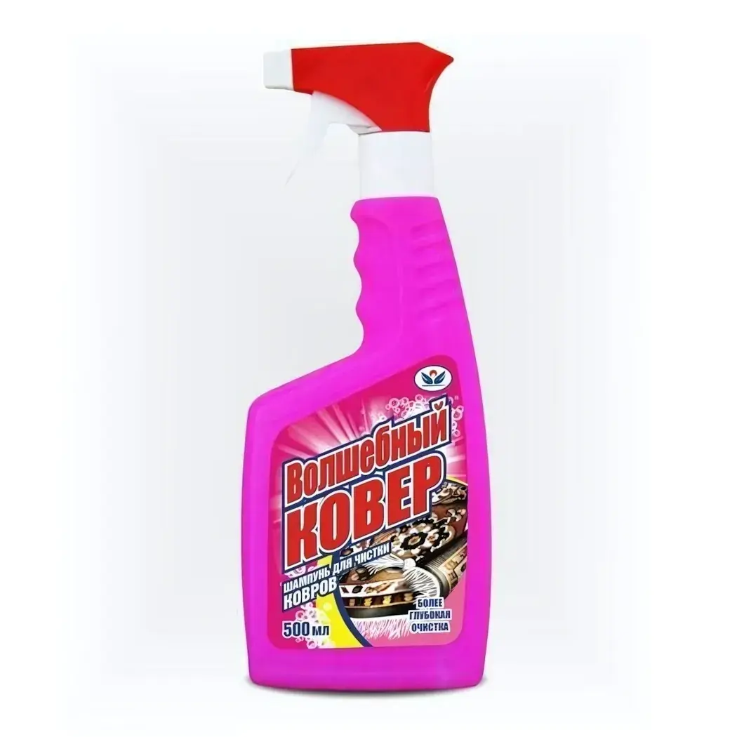 Объем флакона составляет 500 мл, что достаточно для обработки нескольких ковров. Упаковка выполнена в ярко-розовом цвете с белыми и красными элементами, что делает ее заметной и привлекательной. Не упустите возможность сделать ваш дом более чистым и уютным с шампунем 'Волшебный ковер'!