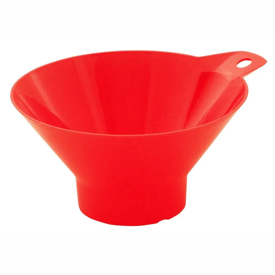 Воронка имеет классическую коническую форму. Диаметр верхнего широкого края составляет 145 мм, что оптимально для большинства кухонных задач. Яркий красный цвет делает предмет легко заметным среди других кухонных принадлежностей. Благодаря компактным размерам и лёгкому весу воронку удобно хранить в ящике или подвесить на стену.