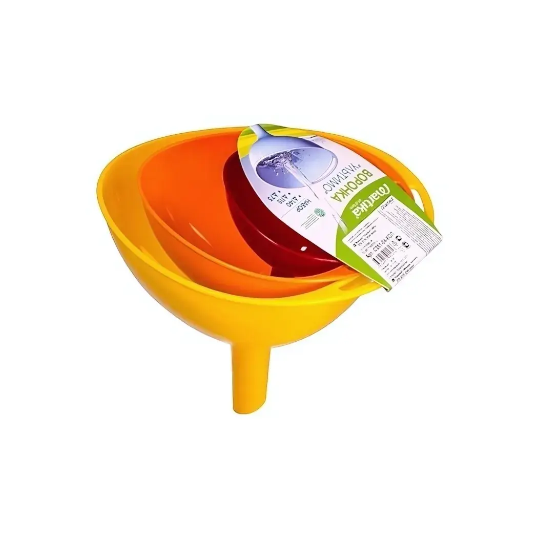 Воронки подходят для переливания различных жидкостей, будь то масла, соусы или соки. Их конусообразная форма с широким верхом и узким носиком обеспечивает удобство наливания, а ручки делают процесс еще более комфортным. Набор включает три воронки разных цветов: желтую, оранжевую и красную, что позволяет легко различать их при использовании.