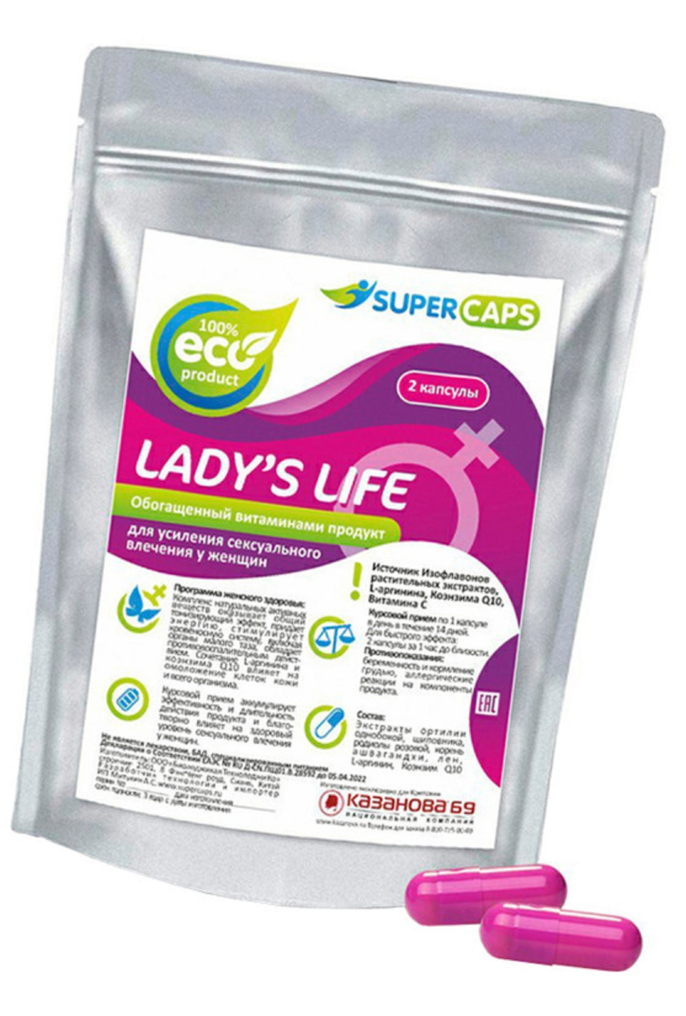 Возбуждающие капсулы 'LADY'S LIFE' 2шт, натуральный состав, усиление влечения