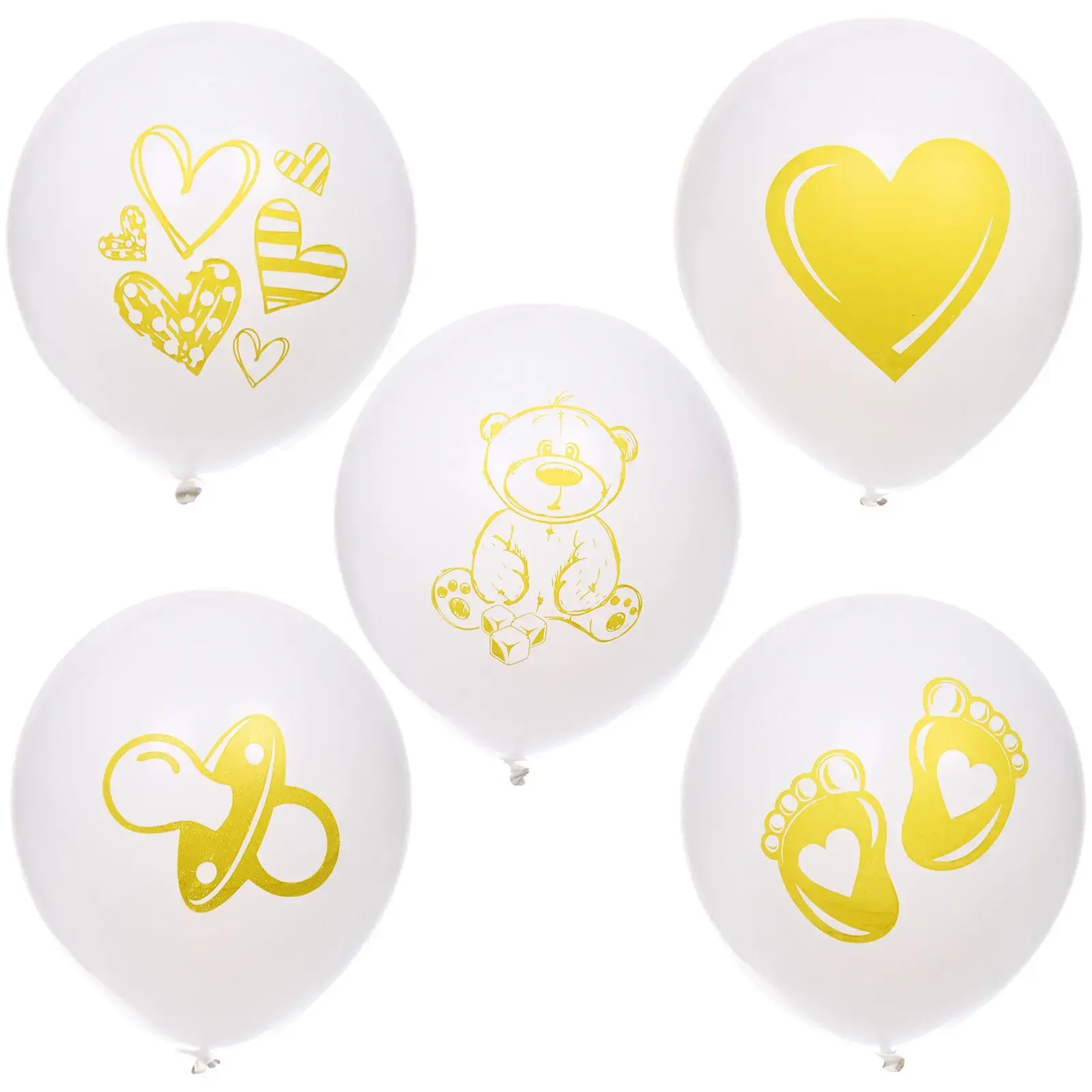 Создайте атмосферу радости и веселья на вашем празднике с набором воздушных шаров «Здравствуй, Солнышко». Эти белые шары с золотыми рисунками идеально подойдут для детских мероприятий, дней рождения и других торжеств. Каждый шарик украшен милыми изображениями, такими как сердечки и медвежонок, что добавляет игривости и яркости в оформление.