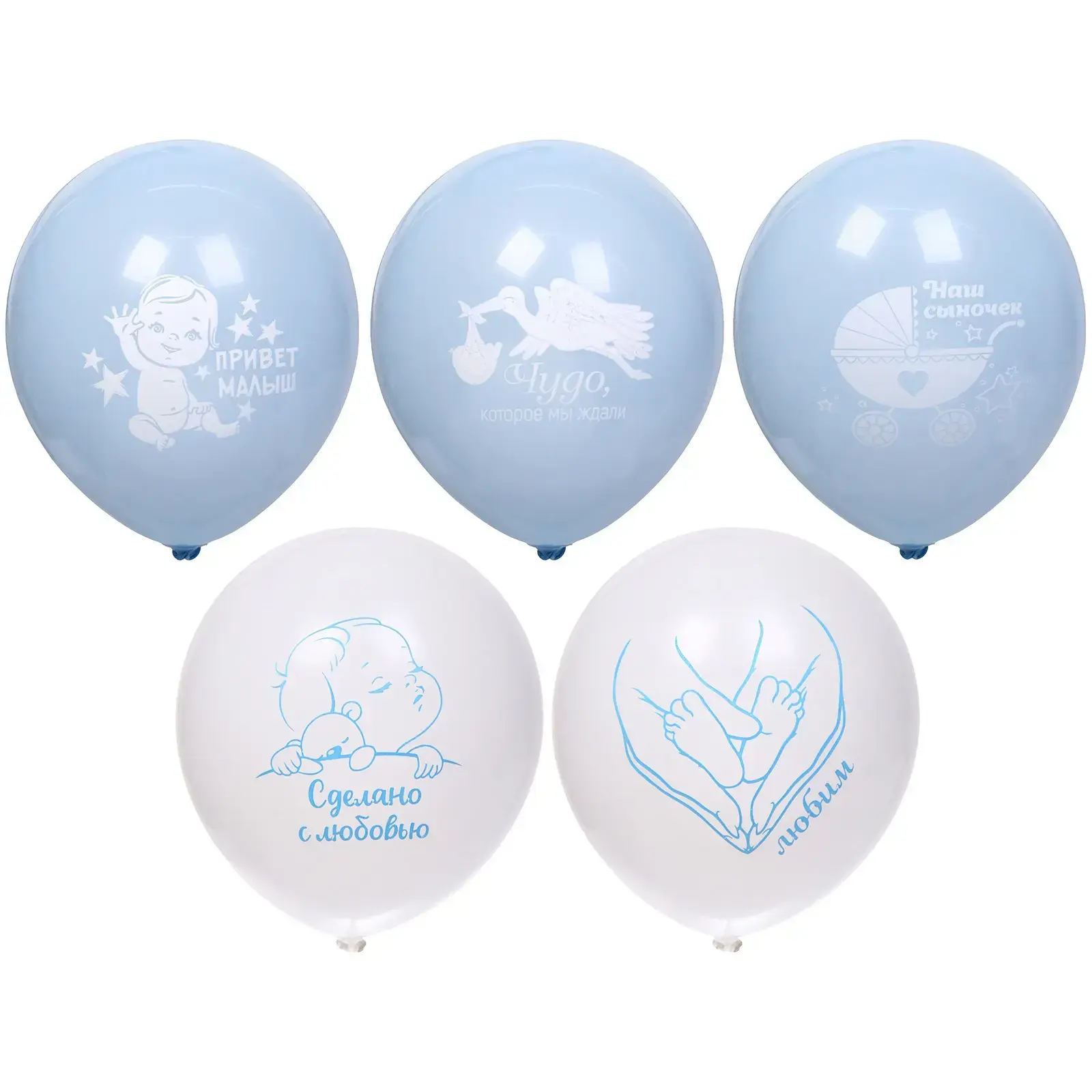Набор из 5 латексных шаров создаст волшебную атмосферу праздника рождения малыша или торжественной выписки из роддома. Яркие голубые и нежные белые оттенки в сочетании с тематическими надписями подчеркнут значимость события.