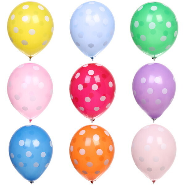 Материал: латекс. Цвета — микс (желтый, голубой, зеленый, розовый, красный, фиолетовый, синий, оранжевый, светло-розовый) с белыми пятнышками. Один шар в упаковке, диаметр — 25 см. Отличное решение для быстрого украшения пространства и создания праздничной атмосферы вне зависимости от возраста гостей.