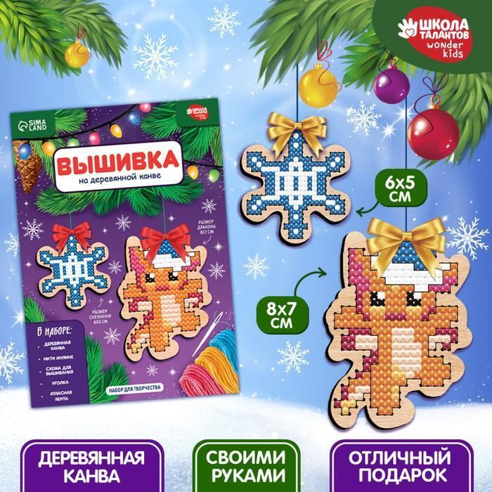 Набор для вышивки крестиком "Дракоша со снежинкой", 6x5 и 8x7 см, деревянная канва, безопасная игла