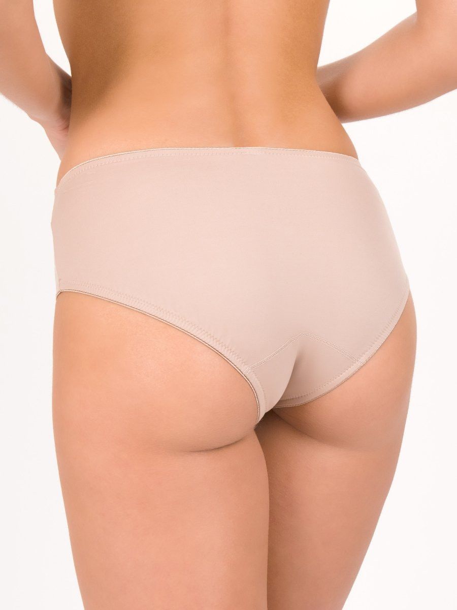 Передняя часть выполнена из ткани с жаккардовым геометрическим рисунком в горошек и дополнена аккуратной вышивкой по линии пояса. Задняя часть из гладкой шелковистой микрофибры обеспечивает мягкое прилегание и аккуратный внешний вид под одеждой. Эластичный кант по контуру способствует удобной посадке и помогает изделию сохранять форму.