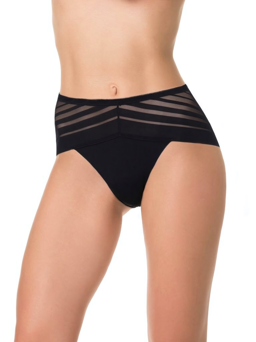 Черные высокие трусики Amoret созданы для тех, кто ценит удобство и элегантность в повседневной жизни. Уникальный полосатый дизайн и деликатные материалы делают это бельё незаменимым для создания безупречного образа.
