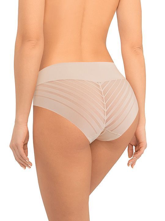 Основные преимущества включают высокую линию талии, которая подчеркивает фигуру и обеспечивает SUPPORT, а также мягкий, эластичный материал, не вызывающий дискомфорта. Передняя часть выполнена из мягкой микрофибры, а задняя — из декоративного полотна с полосками разной ширины, создавая стильный и аккуратный дизайн. Линия талии проклеена для плотной посадки, а потайной шов на хлопковой ластовице гарантирует комфорт при ношении. Трусики подходят для ежедневного использования, позволяют чувствовать себя уверенно и свободно, и идеально сочетаются с разным стилем одежды. Размер XL, цвет бежевый, материалы — 76% нейлон, 24% спандекс, произведено в России брендом Amoret.