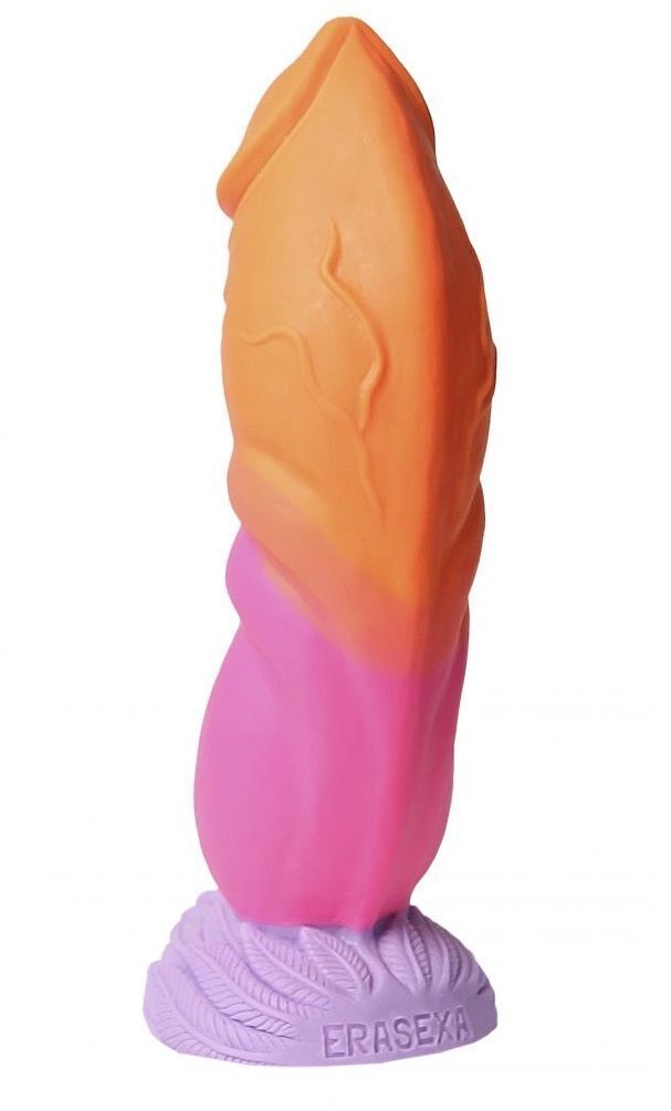 Изделие изготовлено из высококачественного силикона, безопасного для здоровья и приятного на ощупь. Устойчивое основание с декоративным узором в виде пёрышек позволяет использовать игрушку на любой поверхности. Яркие цветовые переходы от оранжевого к фиолетовому создают особое настроение.