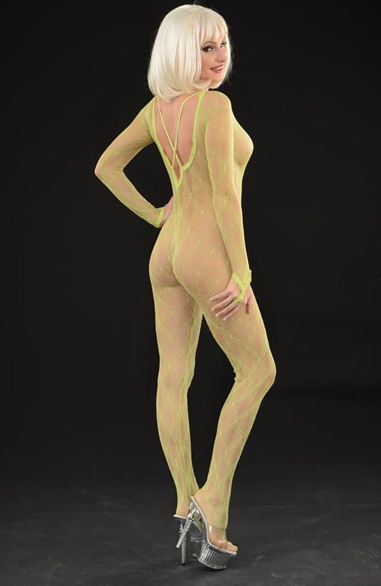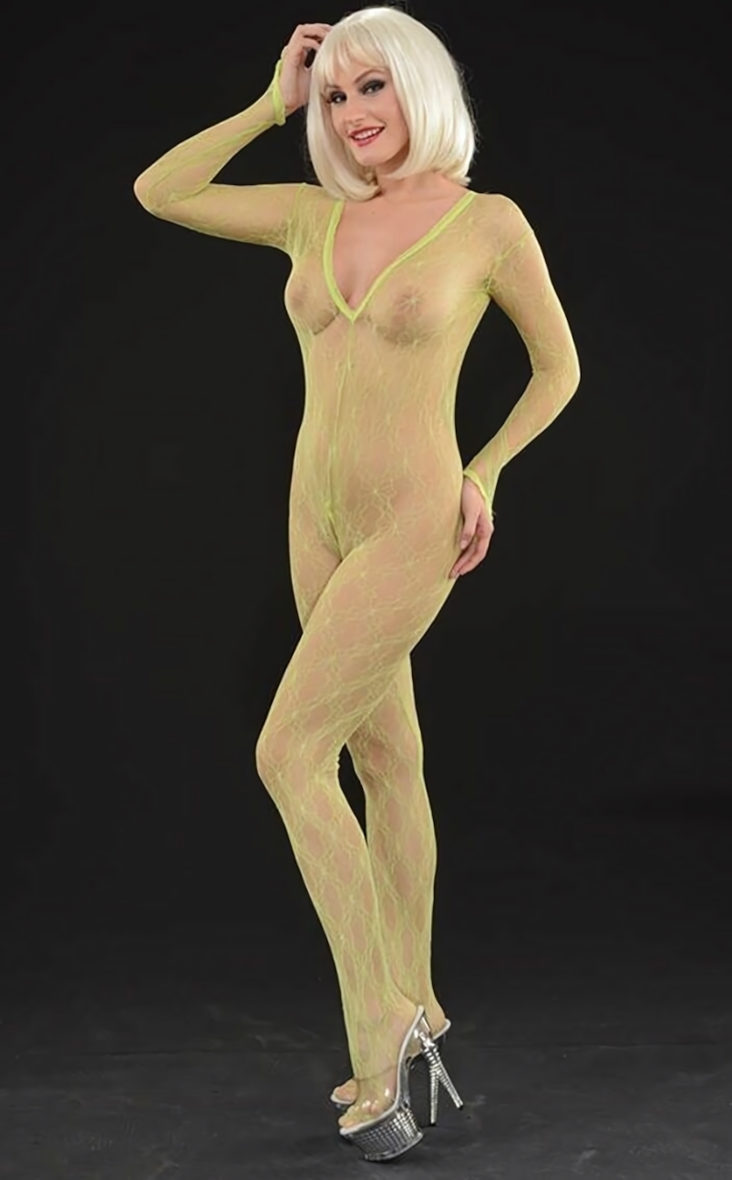 Кэтсьюит эротичный из ажурной сетки, V-образный вырез, петелька на пальце, размер S-M-L, цвет лаймовый