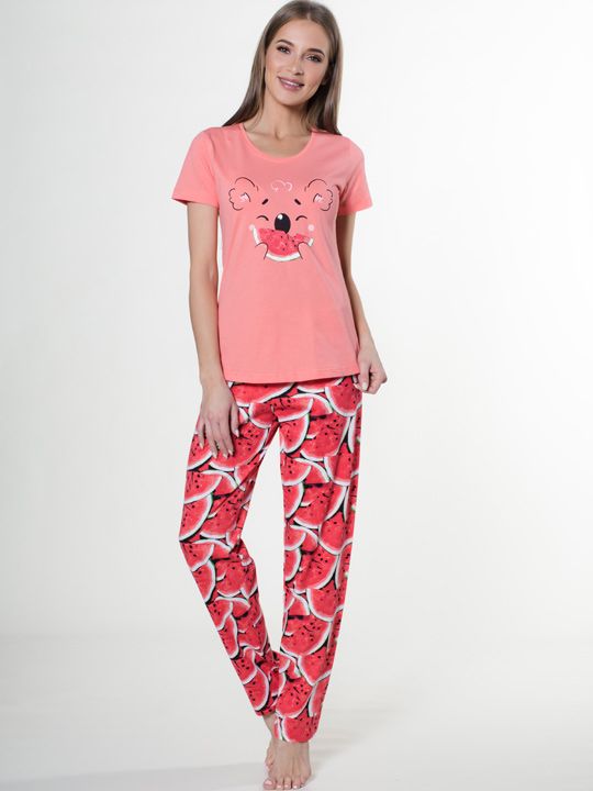 Погрузитесь в мир комфорта и позитивных эмоций с ярким пижамным комплектом "Арбузная вечеринка". Этот набор из футболки и брюк, выполненный из натурального хлопка, станет вашим любимым вариантом для отдыха дома, обеспечивая невероятную мягкость и свободу движений. Яркий летний принт с арбузами и милой коалой поднимет настроение даже в самый хмурый день.