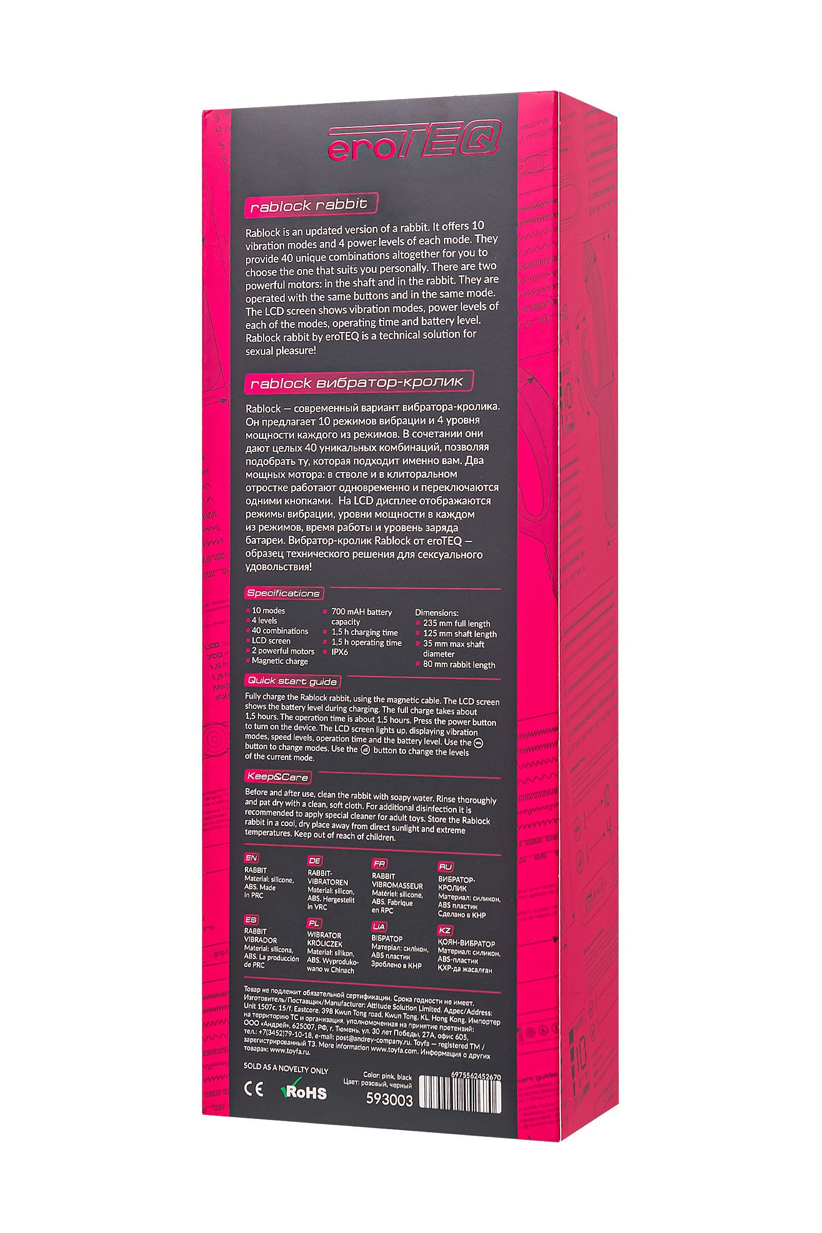 Ярко-розовый вибратор с клиторальной стимуляцией Rablock создан для тех, кто ценит комфорт и качество в интимной жизни. Этот традиционный вибратор-кролик от eroTEQ предлагает вам уникальные ощущения благодаря двум мощным моторам, которые работают одновременно, обеспечивая бескомпромиссную эротическую стимуляцию. С 10 режимами вибрации и 4 уровнями мощности, вы сможете легко найти идеальный вибрационный рисунок, который подарит вам максимум удовольствия и неповторимый оргазм.