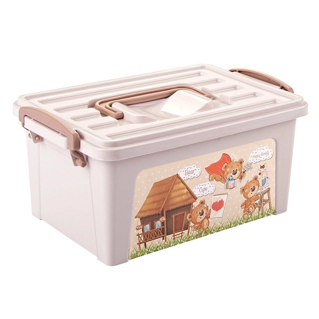 Объём: 9 литров. Материал — жёсткий пластик. Цвет корпуса — светло-бежевый, крышка с рельефными углублениями и встроенной ручкой, боковые защёлки коричневого цвета. На стенках — красочный рисунок с изображением медвежат и домика. Благодаря удобной форме и надёжной конструкции, ящик легко устанавливается в шкаф, на полку или в любое удобное место, помогая рационально организовать пространство.