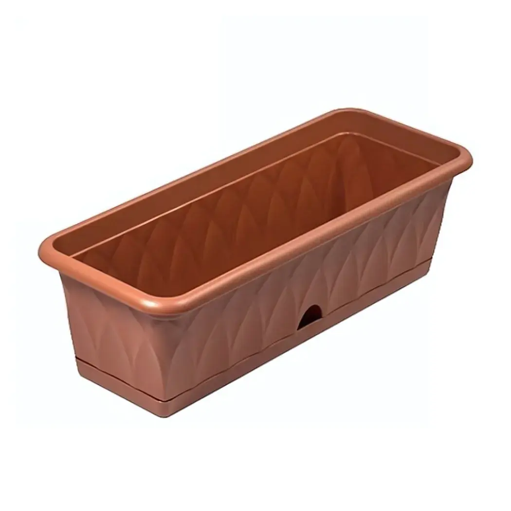 Ящик выполнен из качественного пластика, который не боится влаги и легко очищается. Его гладкая поверхность с рельефным дизайном в виде ромбов добавляет эстетическую привлекательность. Размеры ящика составляют 58 см в длину, что делает его универсальным для различных видов растений.