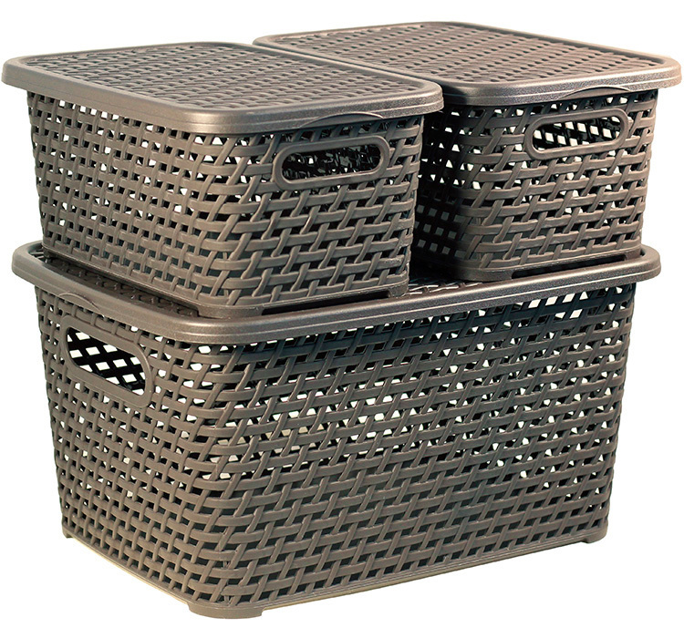 Изготовленный из прочного пластика с текстурой натурального материала, ящик сочетает эстетику плетеной корзины с практичностью современного хранения. Плоская крышка позволяет ставить сверху другие контейнеры или использовать поверхность как дополнительную полку.
