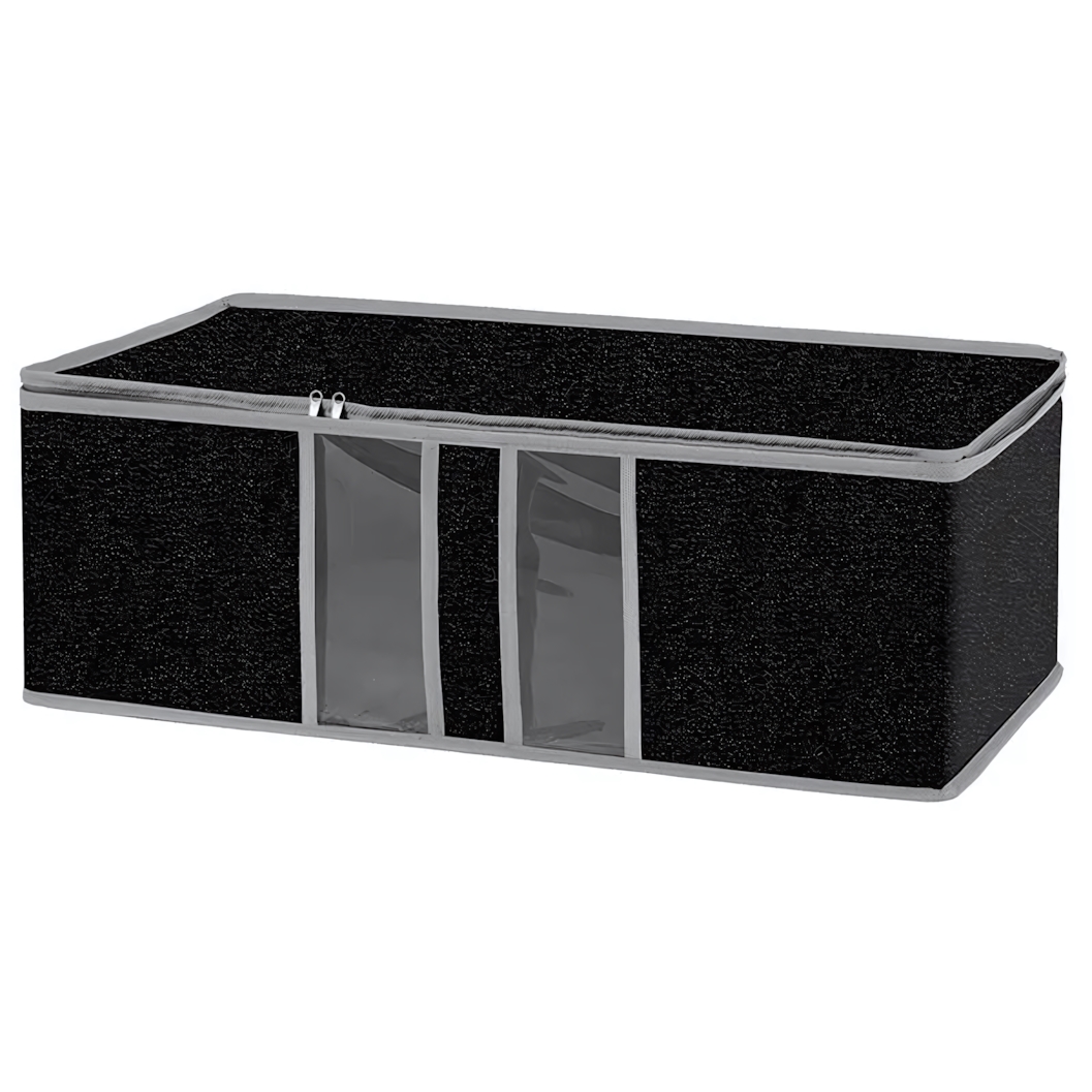 Кофр выполнен из качественного нетканого материала черного цвета с выраженной текстурой. Лаконичный дизайн дополнен аккуратной светло-серой окантовкой по всем граням, что придает изделию эстетичный и завершенный вид. Текстильные стенки обеспечивают естественную вентиляцию, предотвращая появление затхлого запаха при длительном хранении вещей.