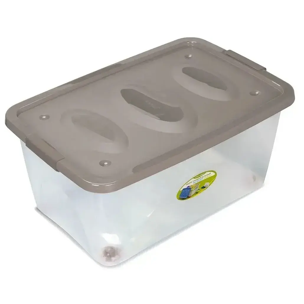 Размеры 60х28х24 см оптимальны для размещения под кроватью или в узких нишах. Серо-коричневая цветовая гамма крышки нейтрально впишется в любой интерьер. Полная прозрачность основного корпуса сохраняется даже после многократного мытья.