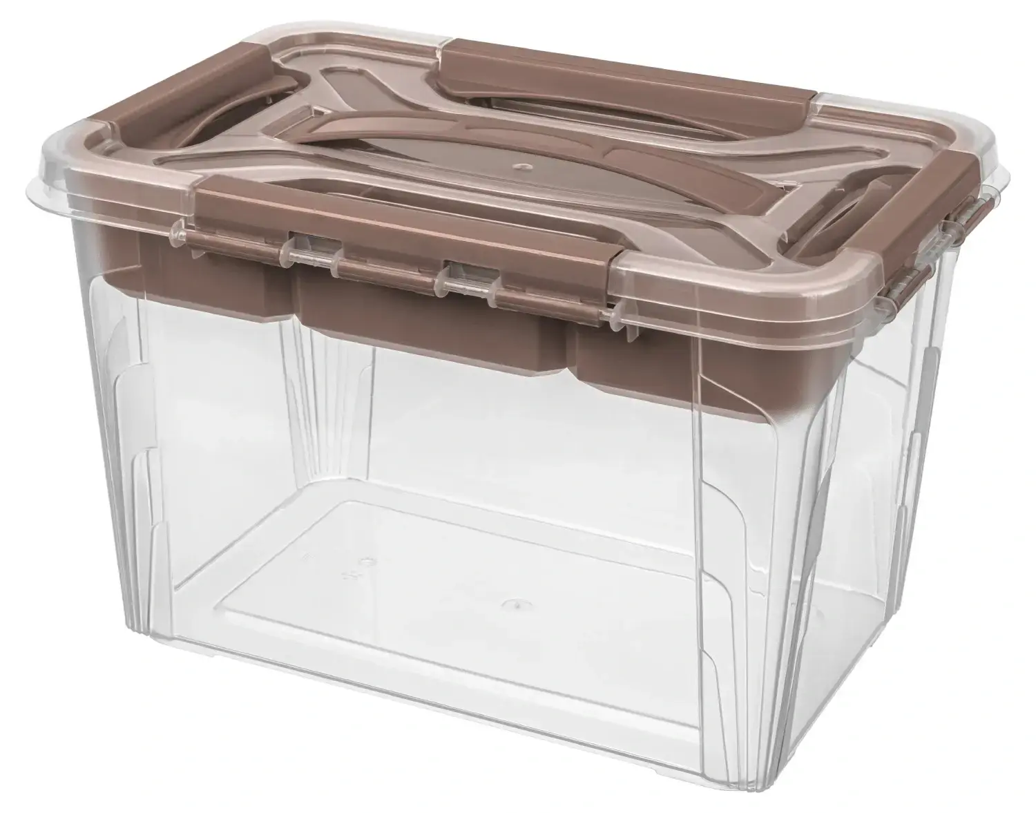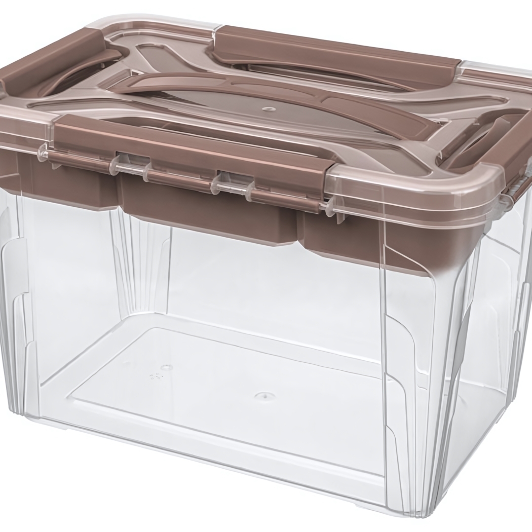 Контейнер имеет прозрачные стенки, что позволяет видеть содержимое без необходимости открывать его. Коричневая крышка с защелками обеспечивает надежное закрытие, а рельефные узоры на поверхности добавляют эстетичности. Этот контейнер станет отличным выбором для хранения различных предметов, обеспечивая порядок и удобство в вашем доме.