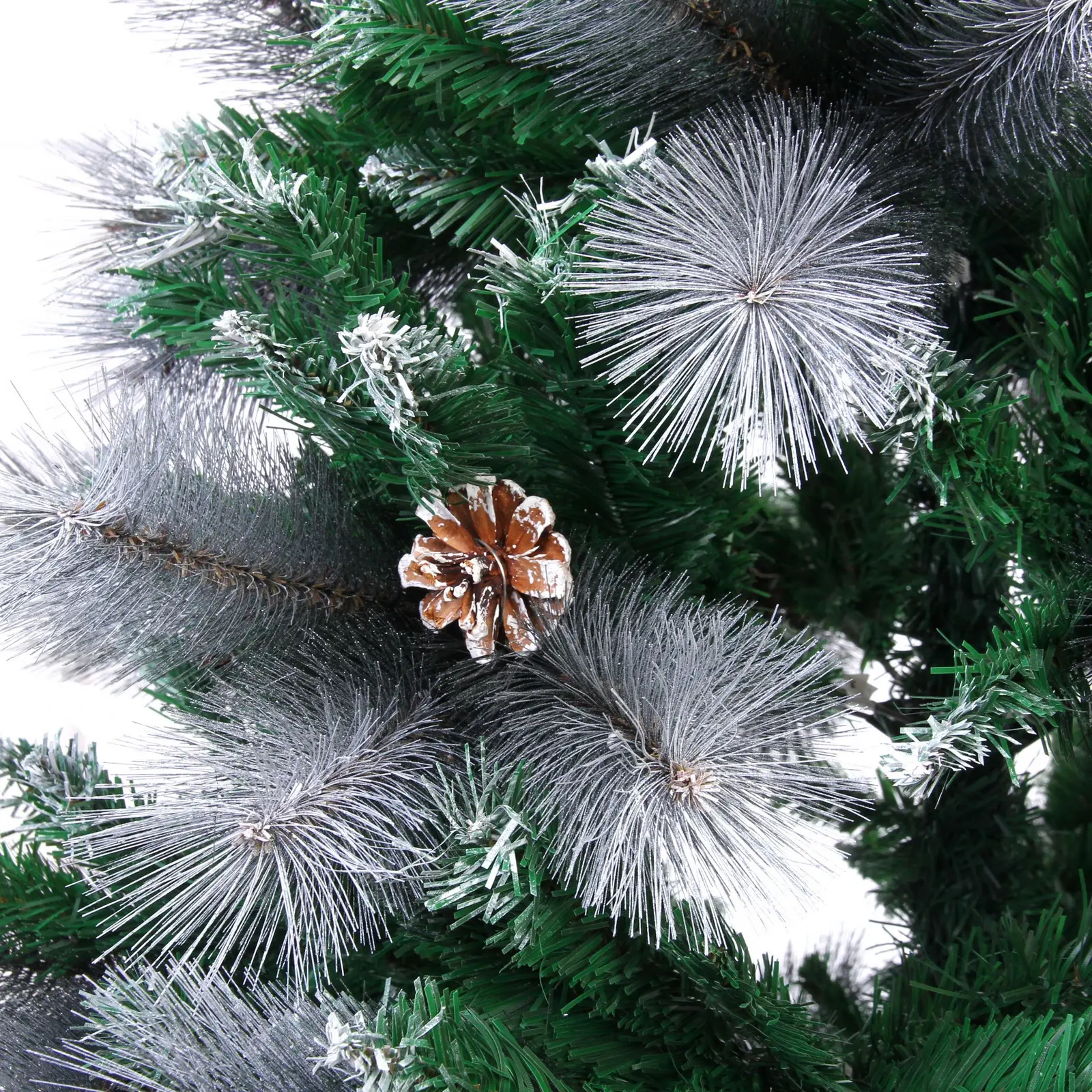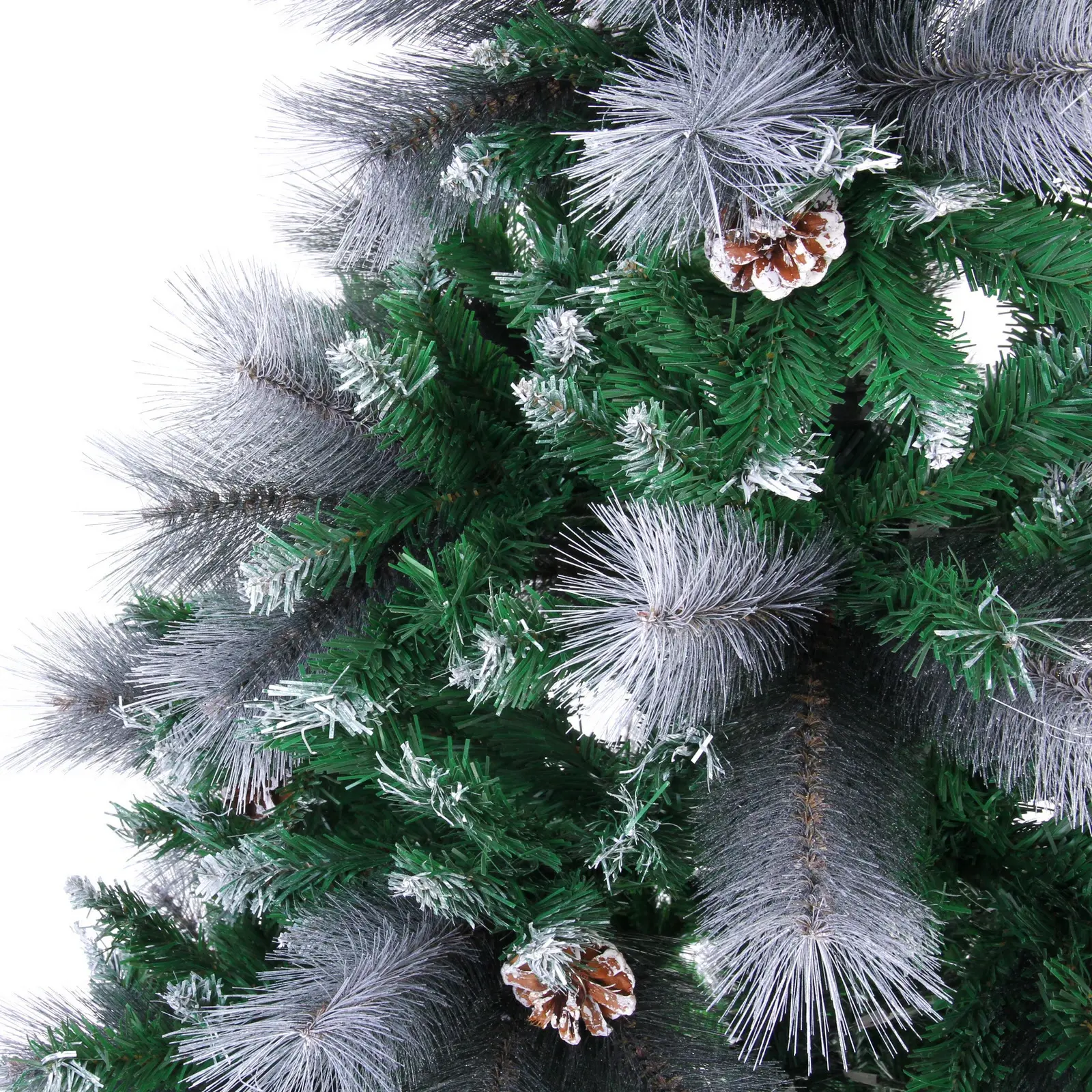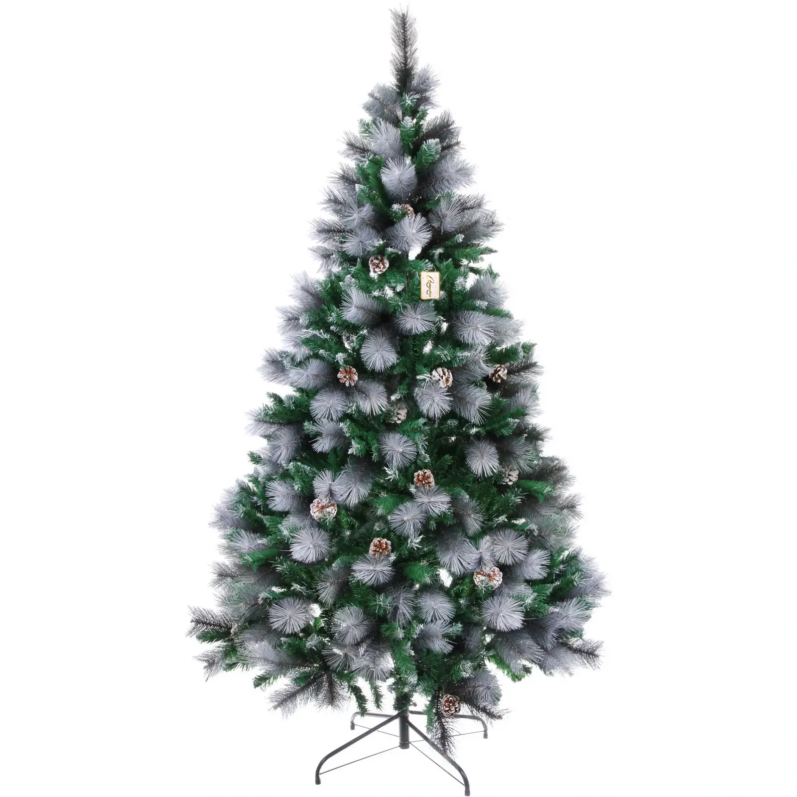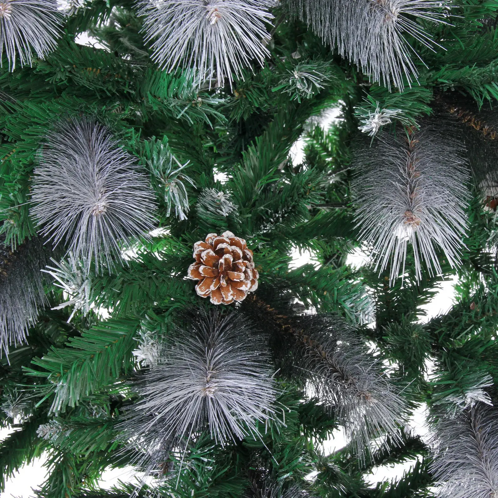 Ёлка имеет 960 веток, что обеспечивает её густоту и объем. Металлическая подставка гарантирует устойчивость конструкции, а разнообразие текстур ветвей создаёт эффект натуральности. Высота 210 см позволяет использовать ёлку в помещениях с высокими потолками, а белое напыление и шишки добавляют ей праздничного настроения.