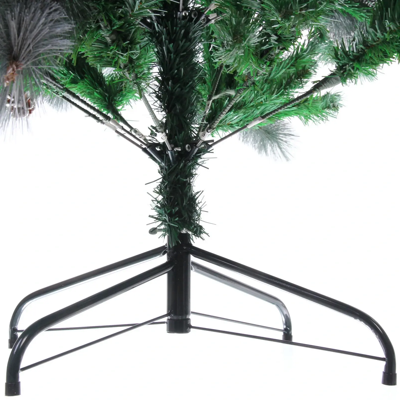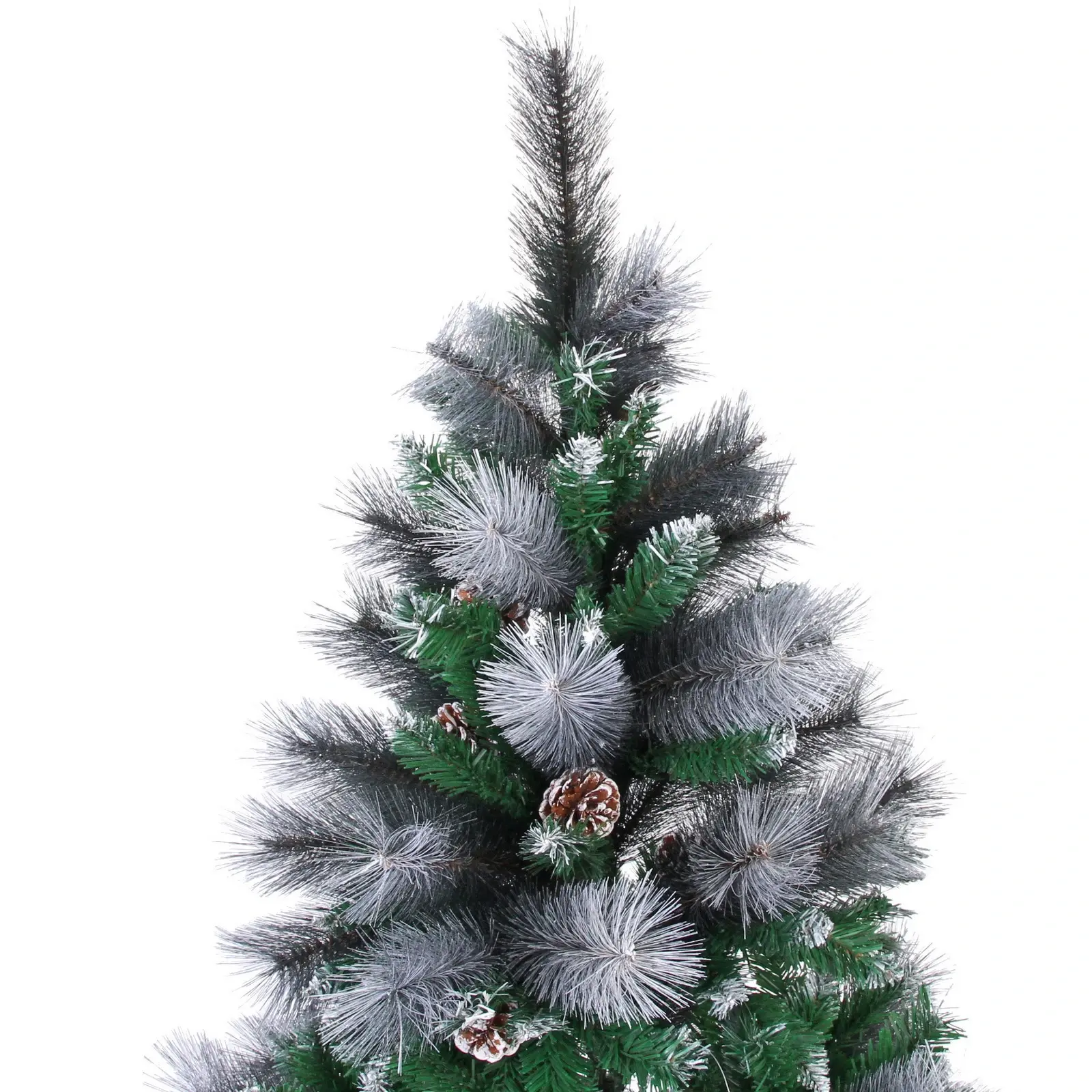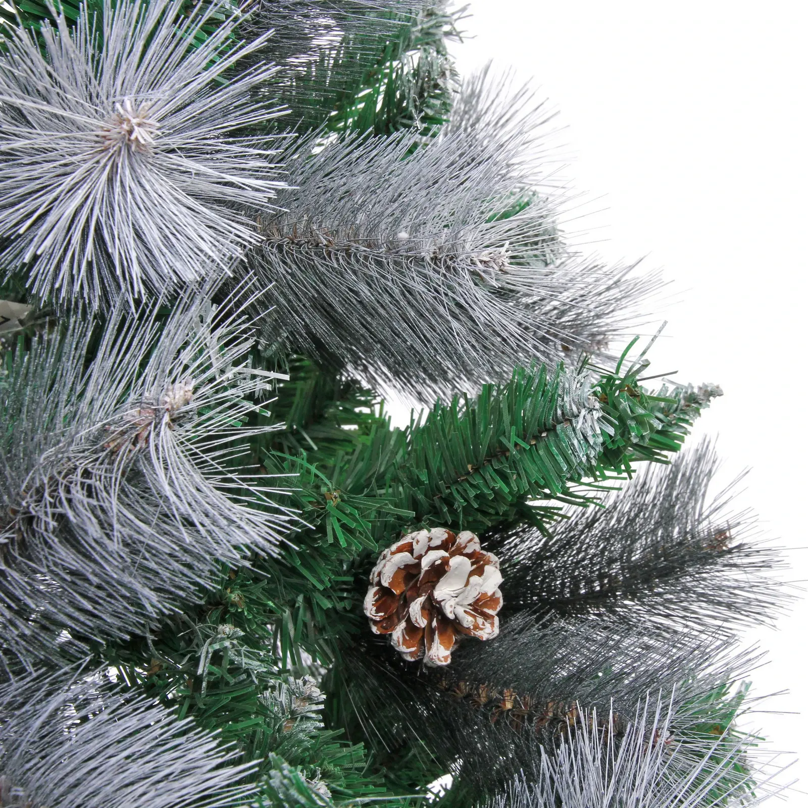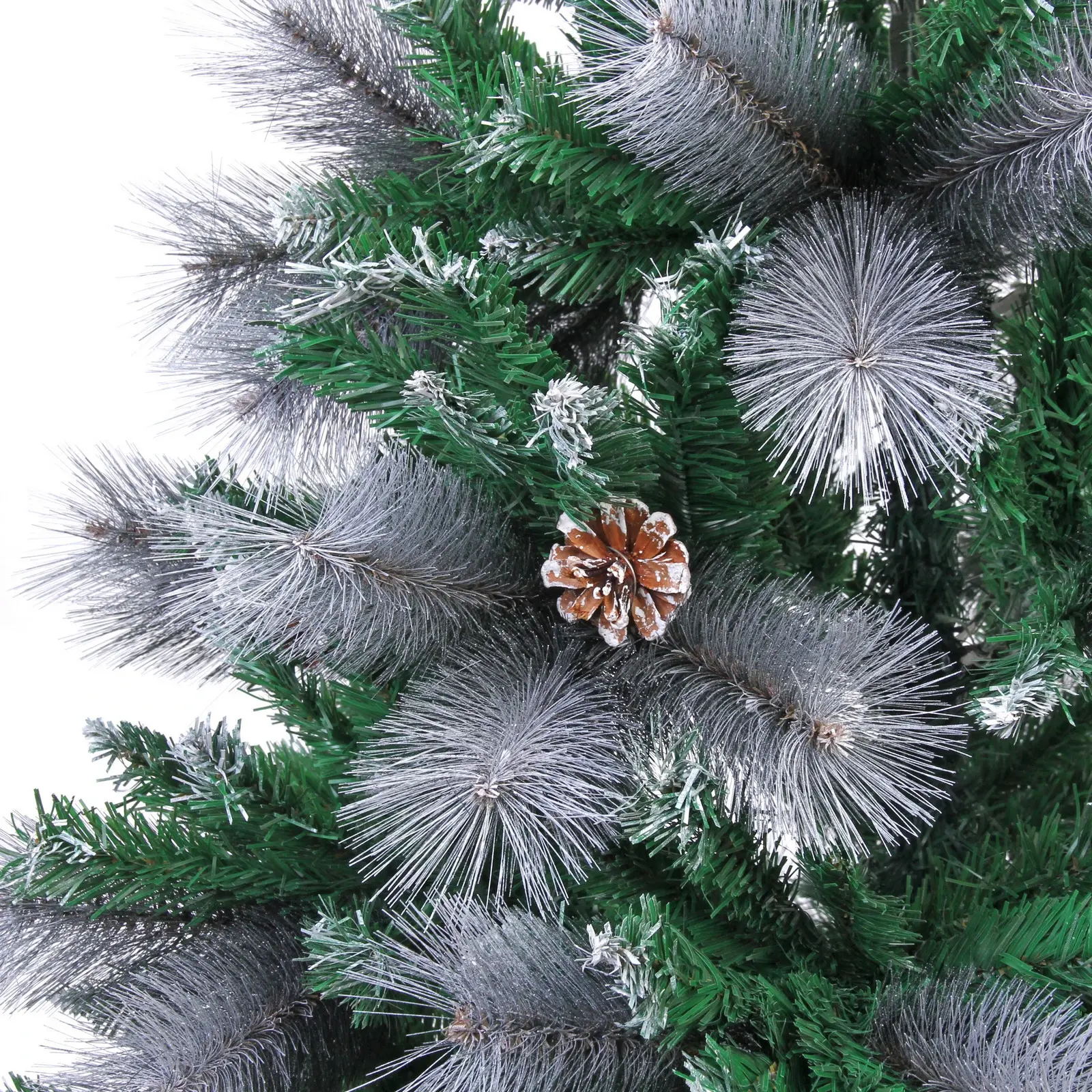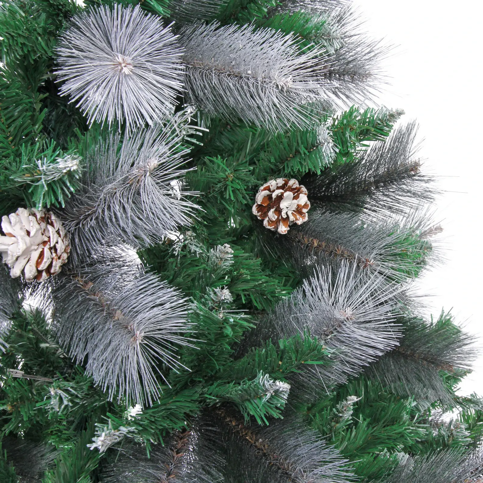 Ёлка имеет 960 веток, что обеспечивает её густоту и объем. Металлическая подставка гарантирует устойчивость конструкции, а разнообразие текстур ветвей создаёт эффект натуральности. Высота 210 см позволяет использовать ёлку в помещениях с высокими потолками, а белое напыление и шишки добавляют ей праздничного настроения.