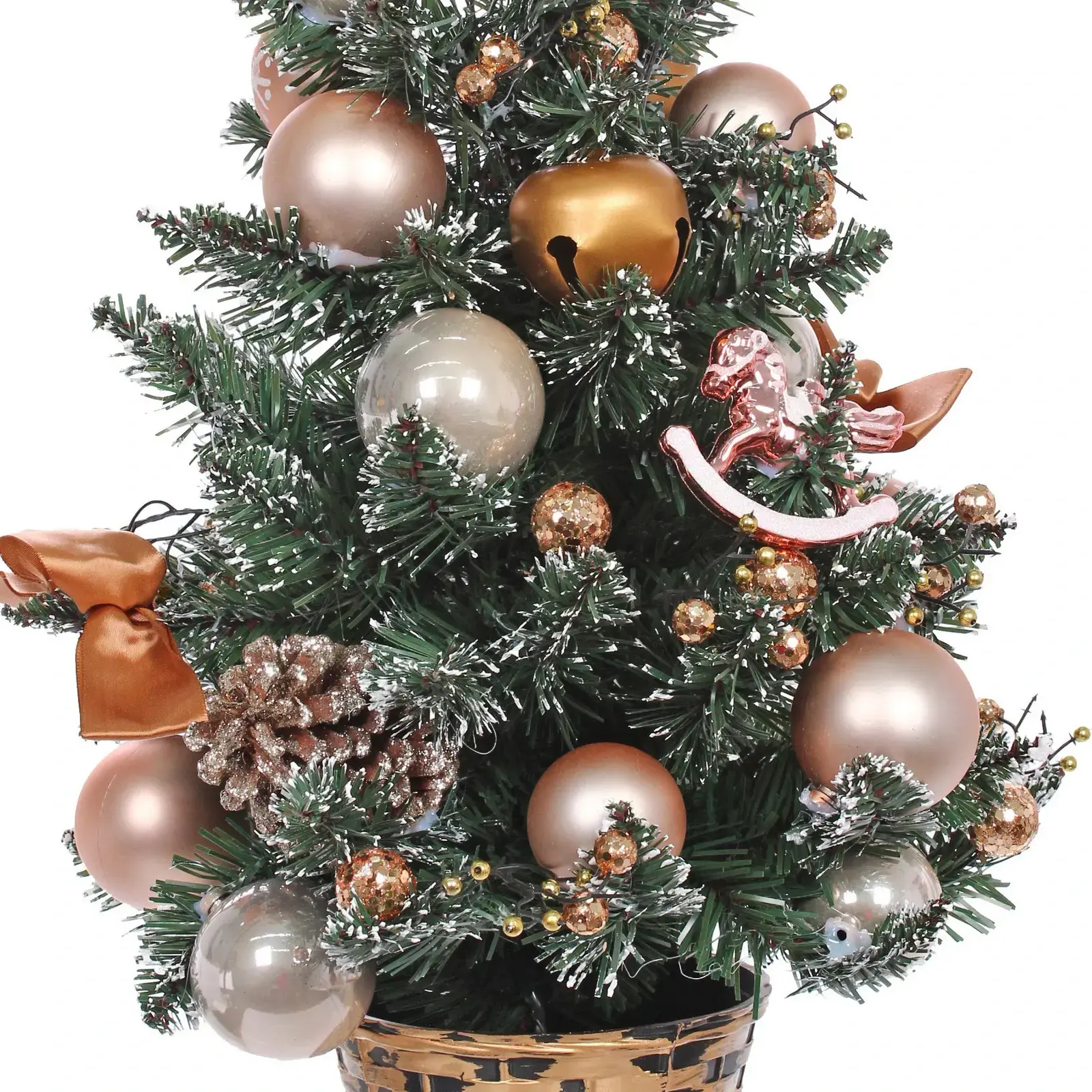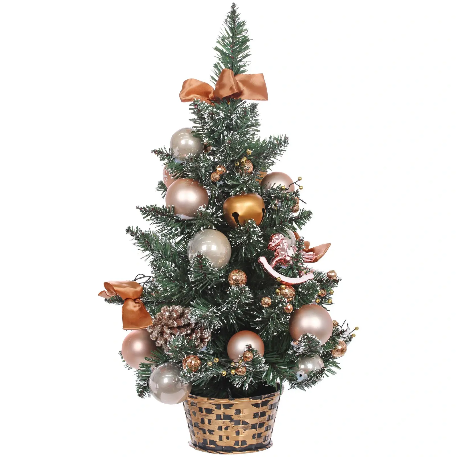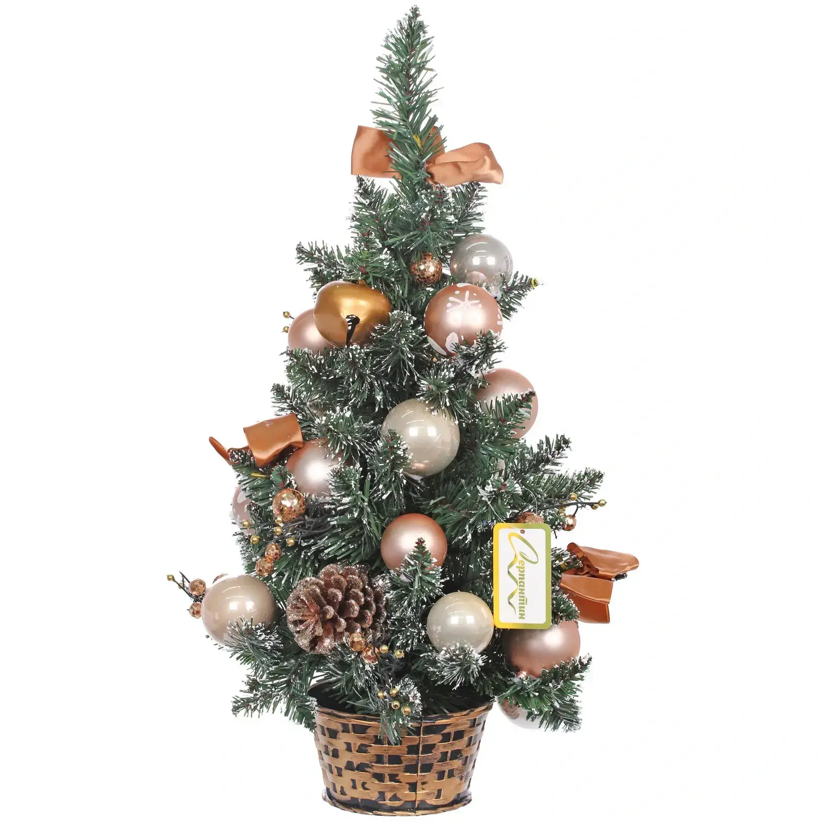 Высота изделия – 60 см, материал – ПВХ, цвет – зелёно‑белый (имитация покрытой снегом еловой ветки). Подставка выполнена в виде плетёного кашпо с металлической вставкой, что добавляет эстетики и повышает устойчивость.