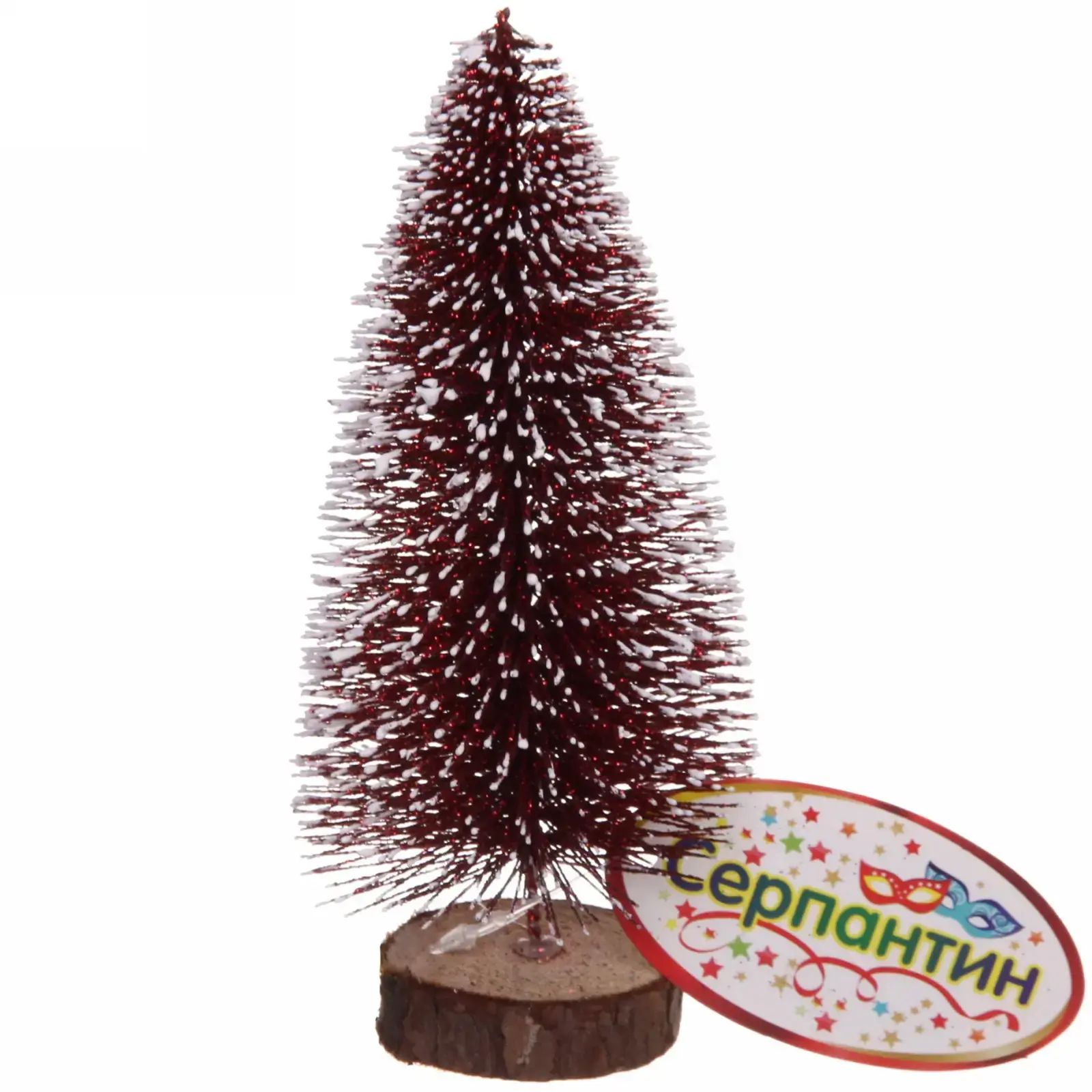 Ёлка выполнена из прочного металла и пластика, что гарантирует её долговечность и устойчивость к повреждениям. Высота 15 см делает её идеальной для настольного декора. Подставка из натурального дерева добавляет изделию стильный и элегантный вид. Праздничный дизайн с блестками и белыми кончиками веток создаёт ощущение настоящего зимнего чуда.