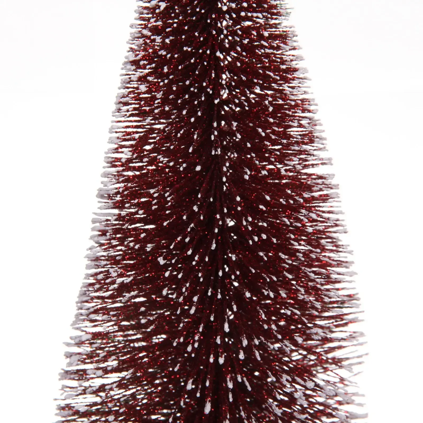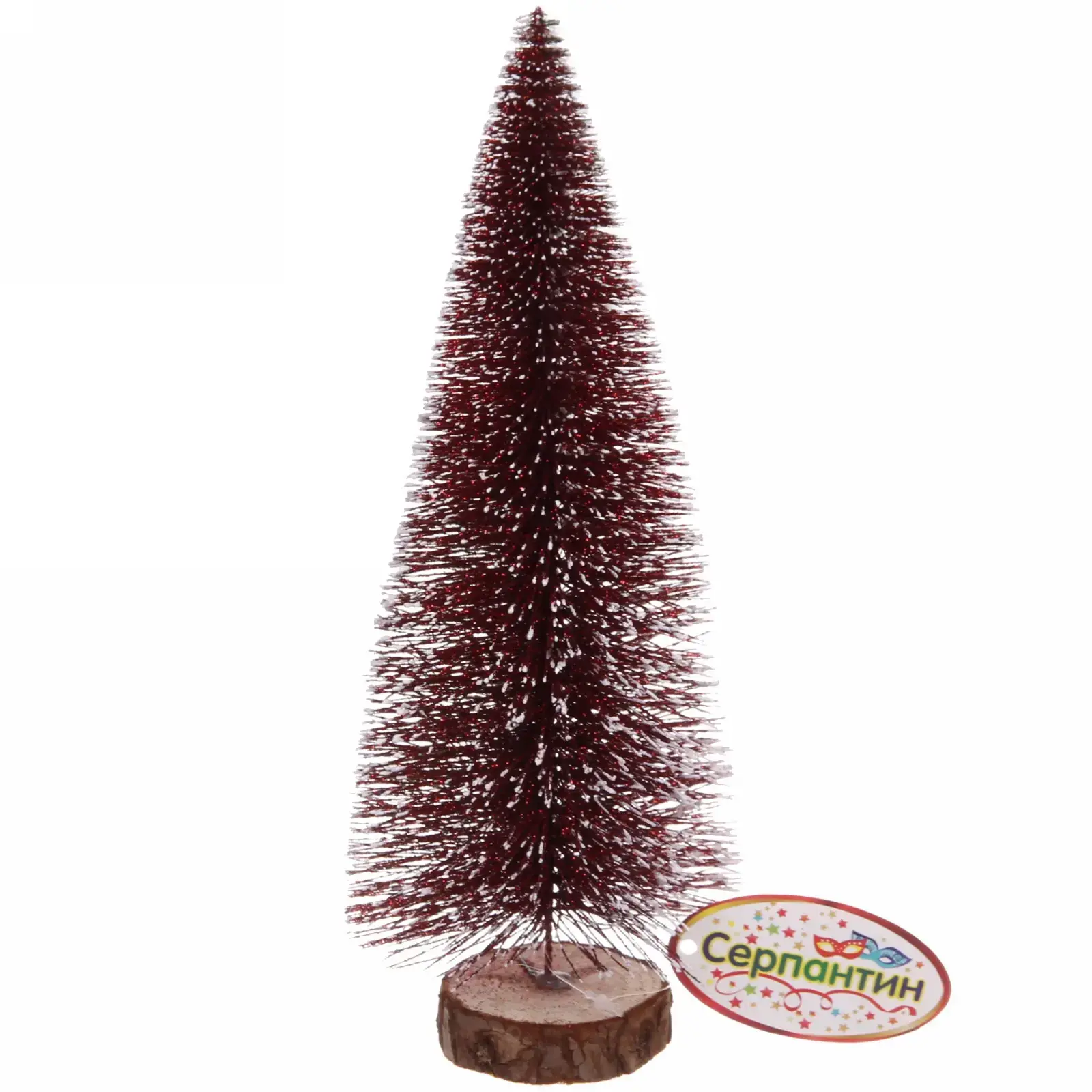 Ёлка имеет конусообразную форму и плотно расположенные ветви, что придаёт ей объёмный вид. Основание выполнено из симпатичного деревянного куска, что добавляет натуральности в общий дизайн. Размеры ёлки делают её идеальной для настольного декора, а тёмно-бордовый цвет легко впишется в любой интерьер.