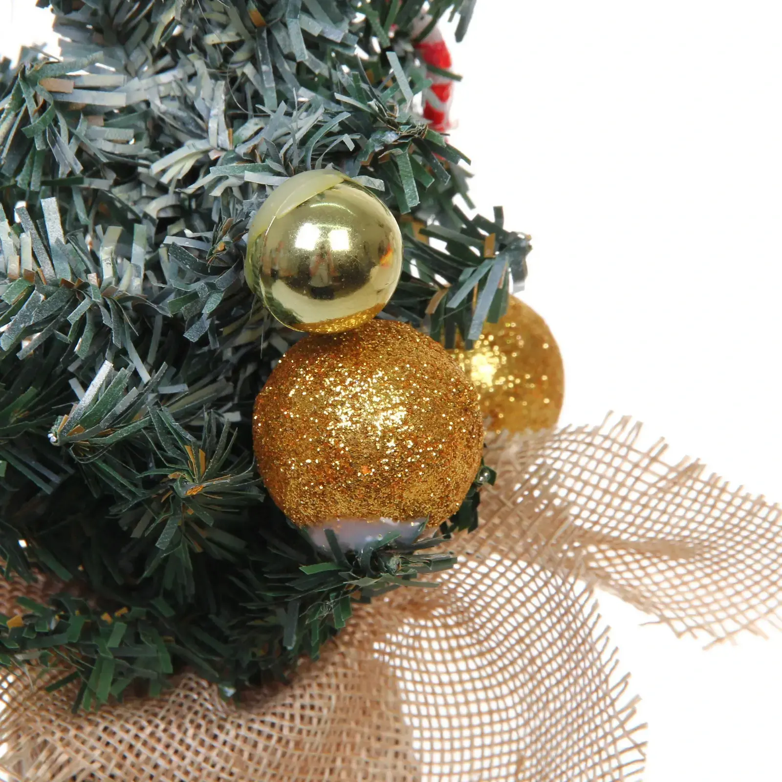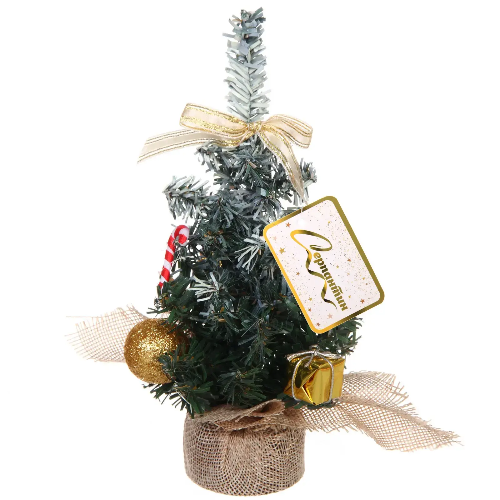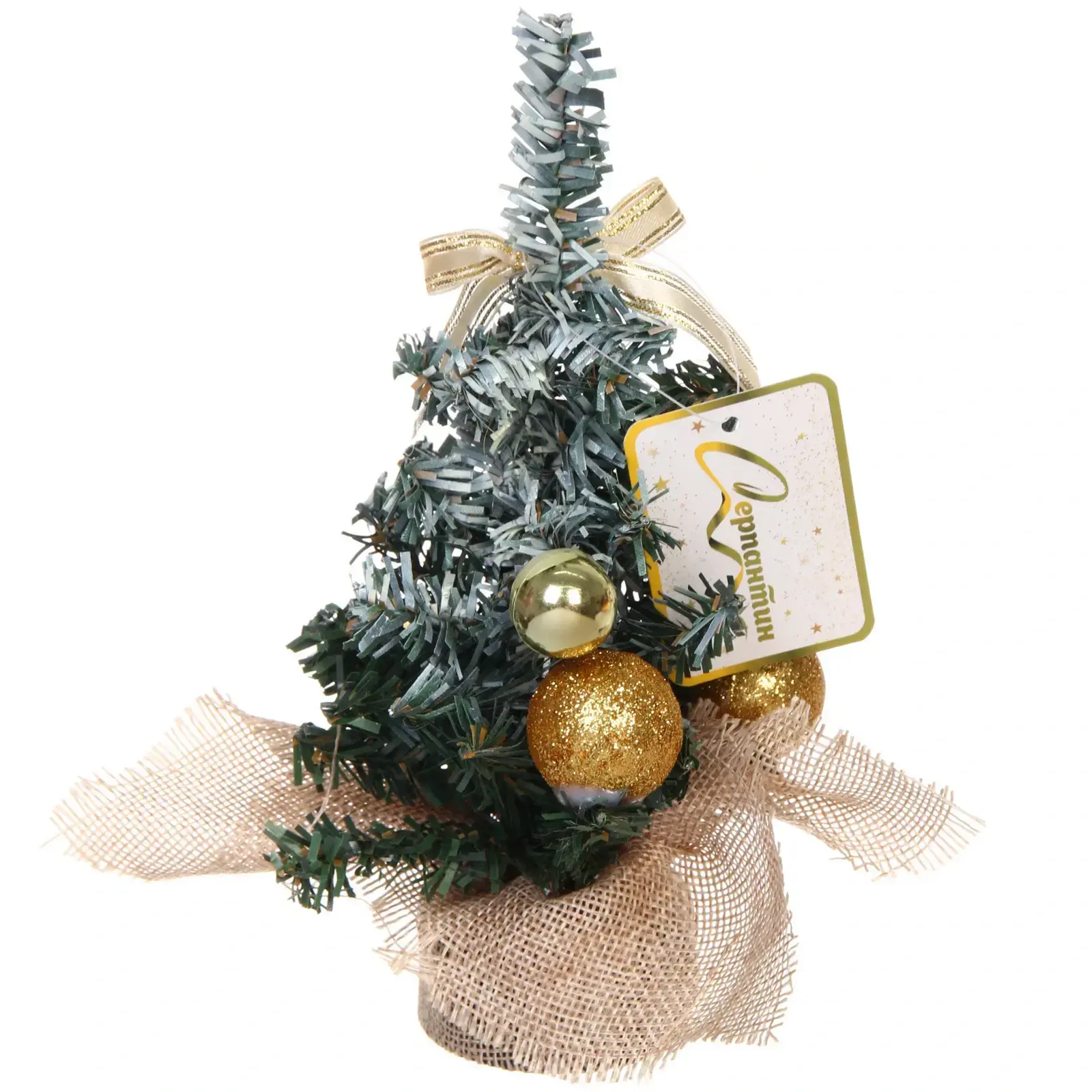 Размер ёлки составляет 20 см, что делает её идеальной для небольших пространств. Она украшена золотыми шарами и лентами, а также имеет основание, оформленное натуральной тканью. Эта ёлка станет отличным подарком для друзей и близких, а также прекрасным элементом декора для новогодних вечеринок.