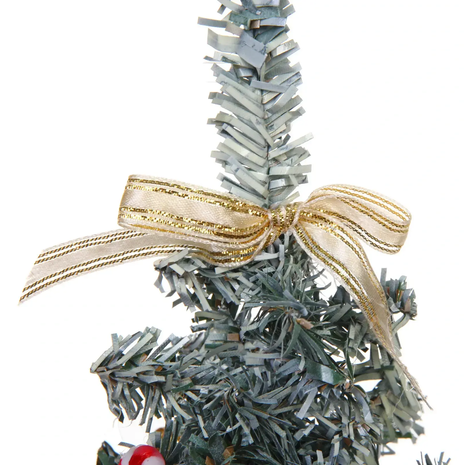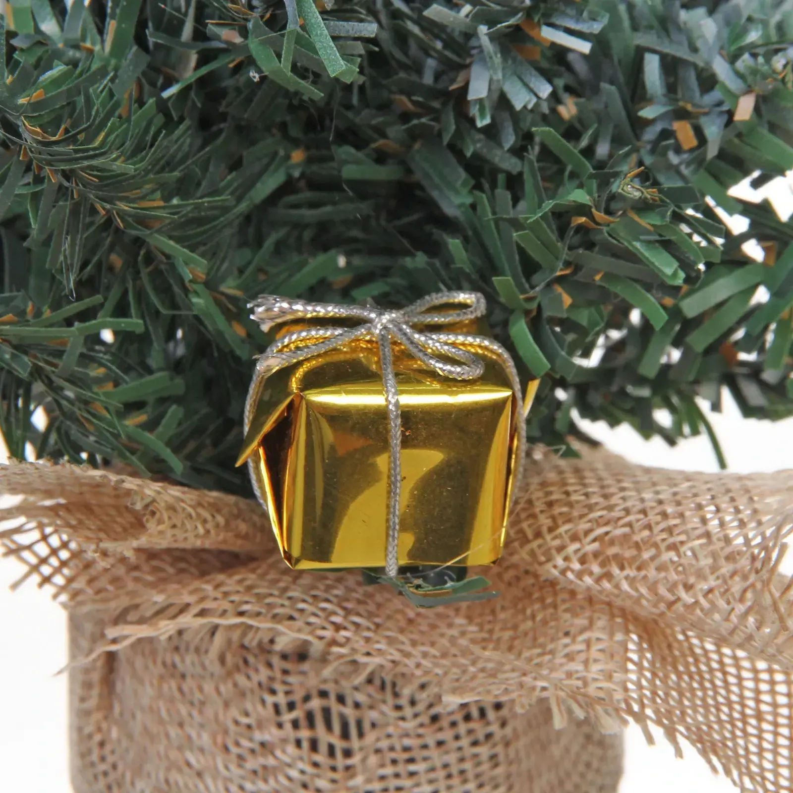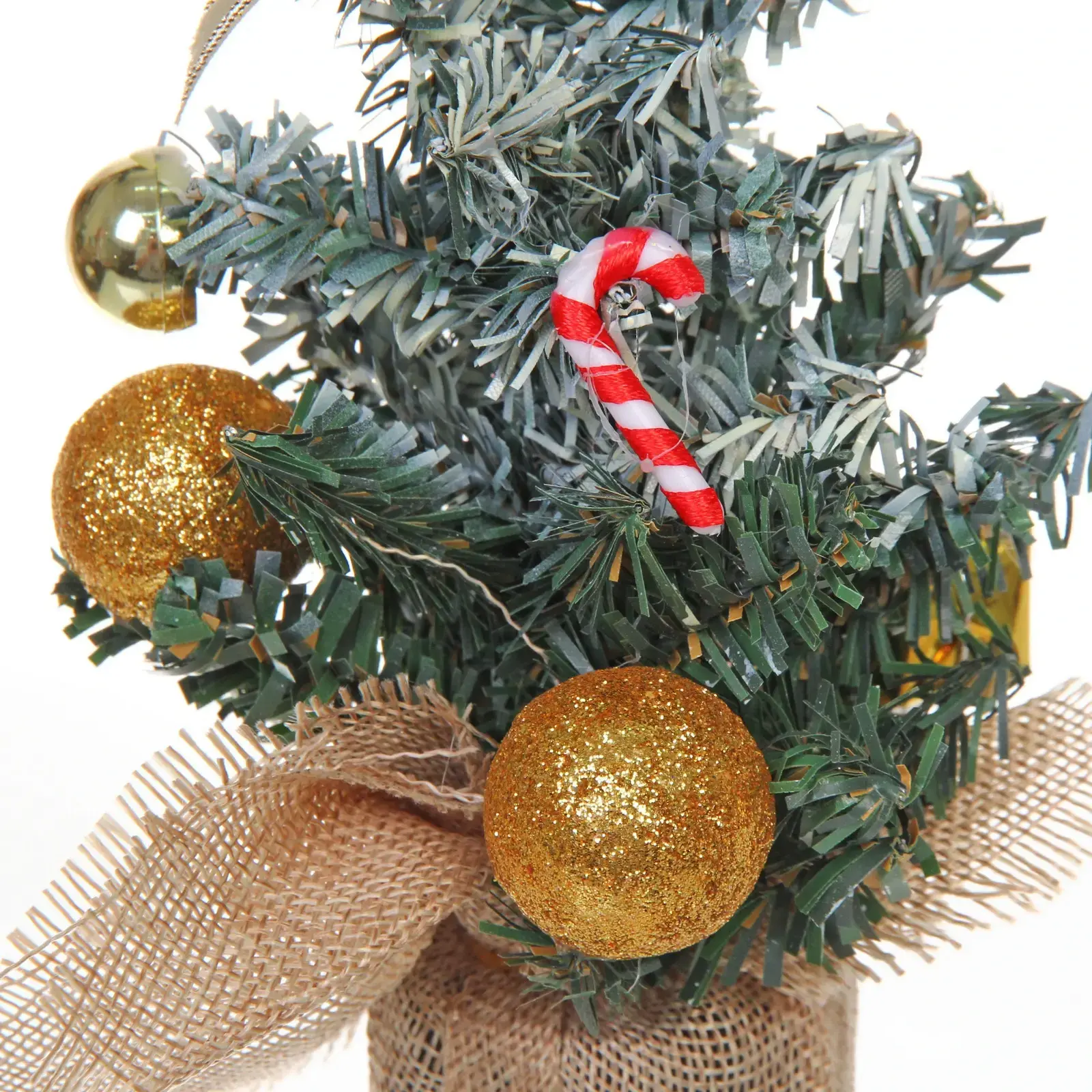 Размер ёлки составляет 20 см, что делает её идеальной для небольших пространств. Она украшена золотыми шарами и лентами, а также имеет основание, оформленное натуральной тканью. Эта ёлка станет отличным подарком для друзей и близких, а также прекрасным элементом декора для новогодних вечеринок.