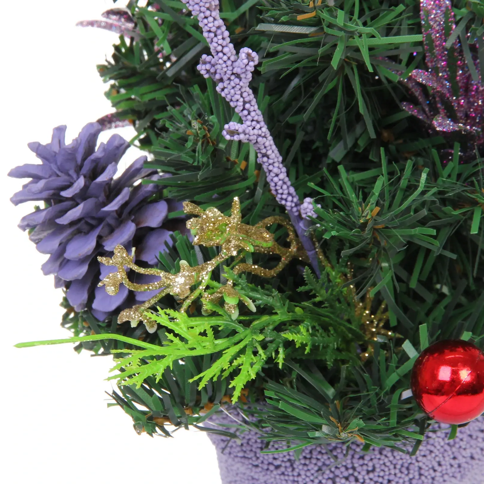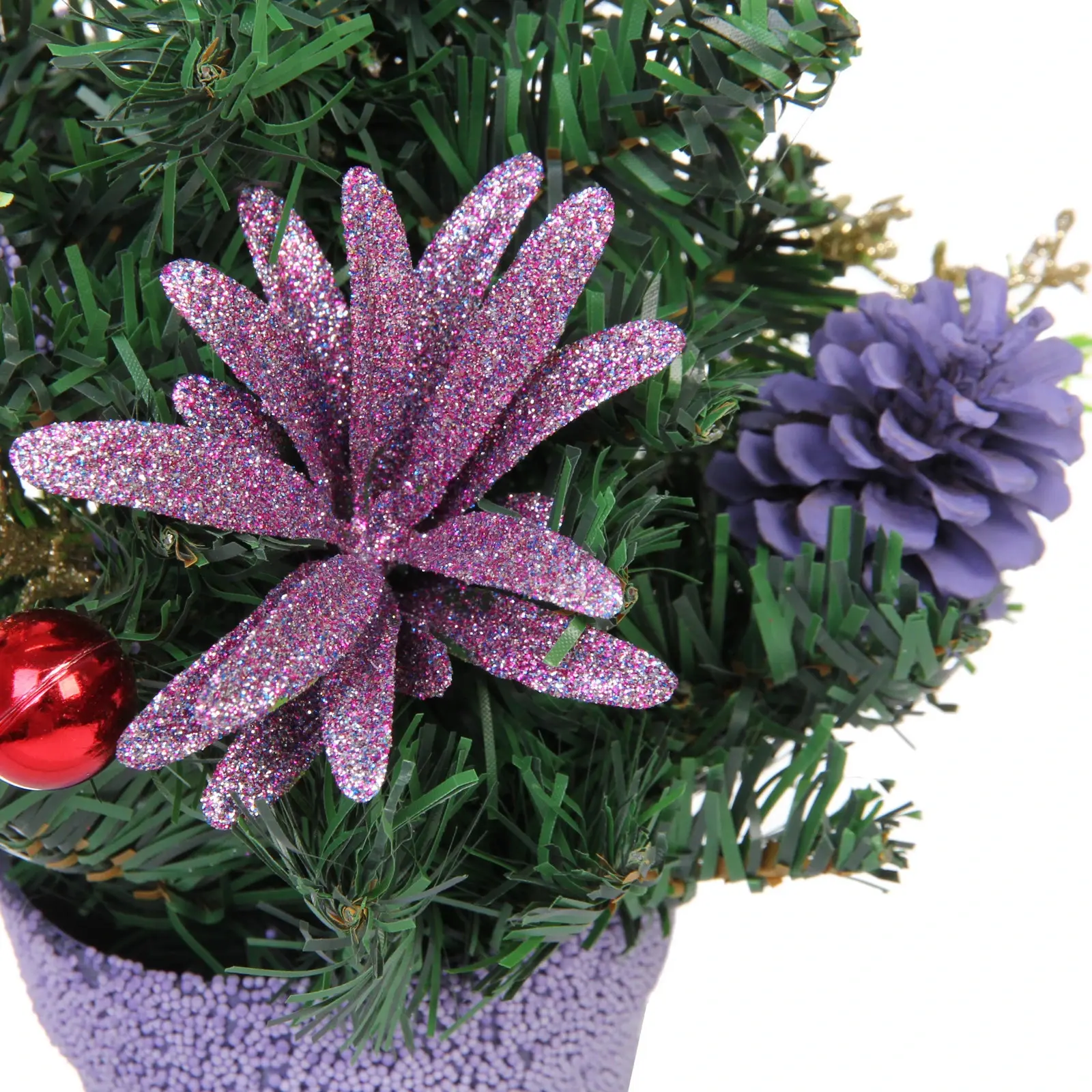 Изготовленная из качественных материалов, таких как металл и ПВХ, ёлка отличается долговечностью и практичностью. Зелёные ветви с иголками имитируют натуральный вид, а яркие декоративные элементы, включая красные шары и фиолетовые цветы, придают ей особый шарм. Горшок светло-лавандового цвета с текстурированной поверхностью добавляет изысканности и стиля.
