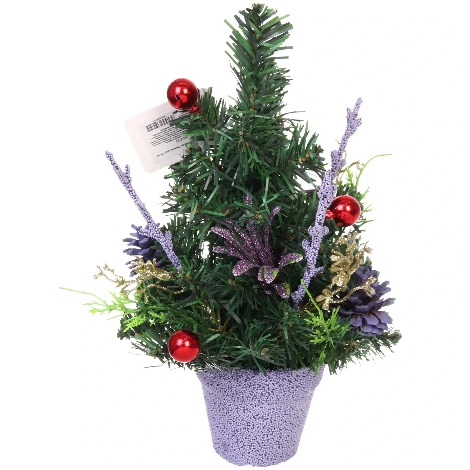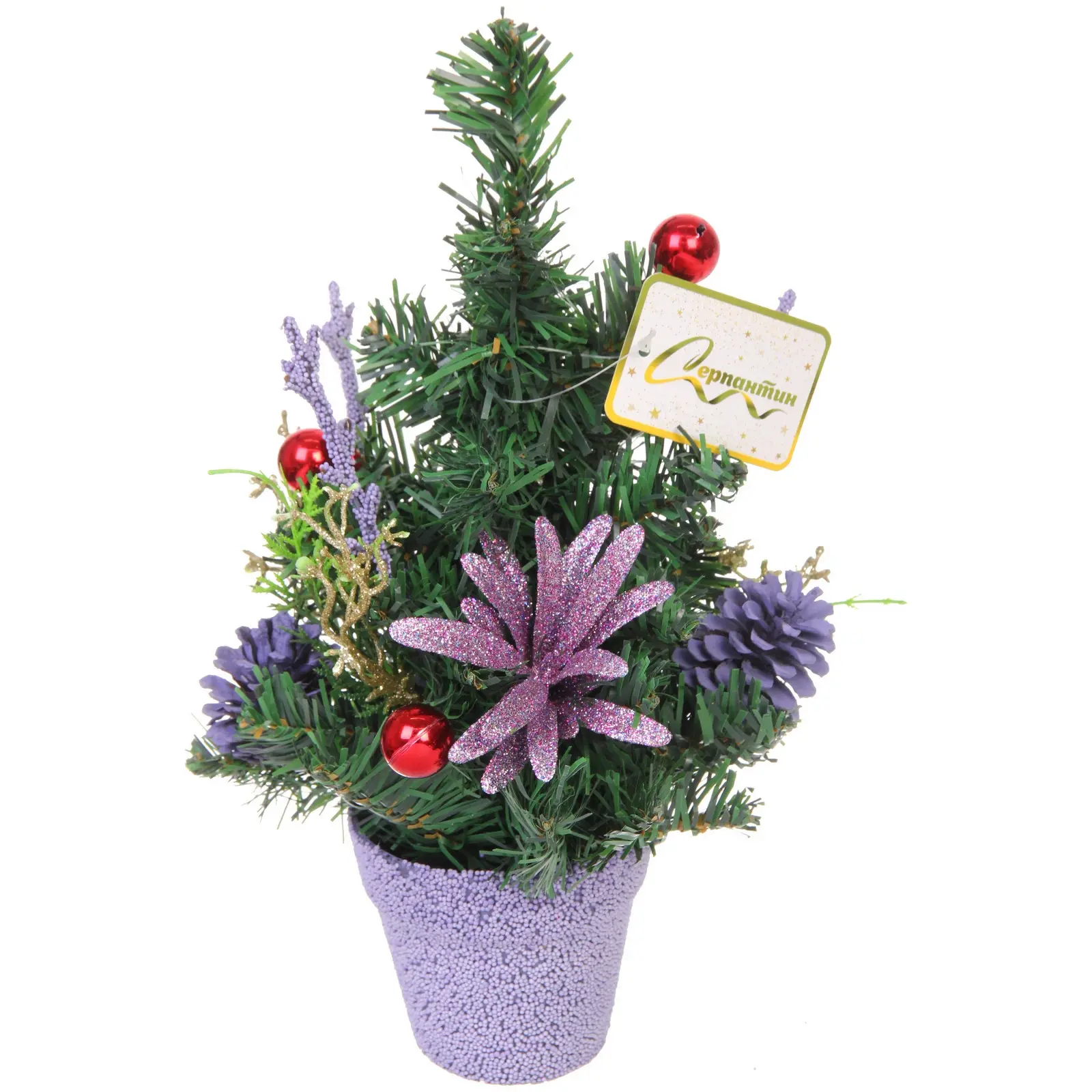 Высота ёлки составляет 30 см, что делает её идеальной для размещения на столах или полках. Декор включает в себя красные шарики, фиолетовые цветы с блестками и шишки, что создает эффектный и праздничный вид. Эта ёлка станет не только украшением, но и символом тепла и уюта в вашем доме в новогодние праздники.