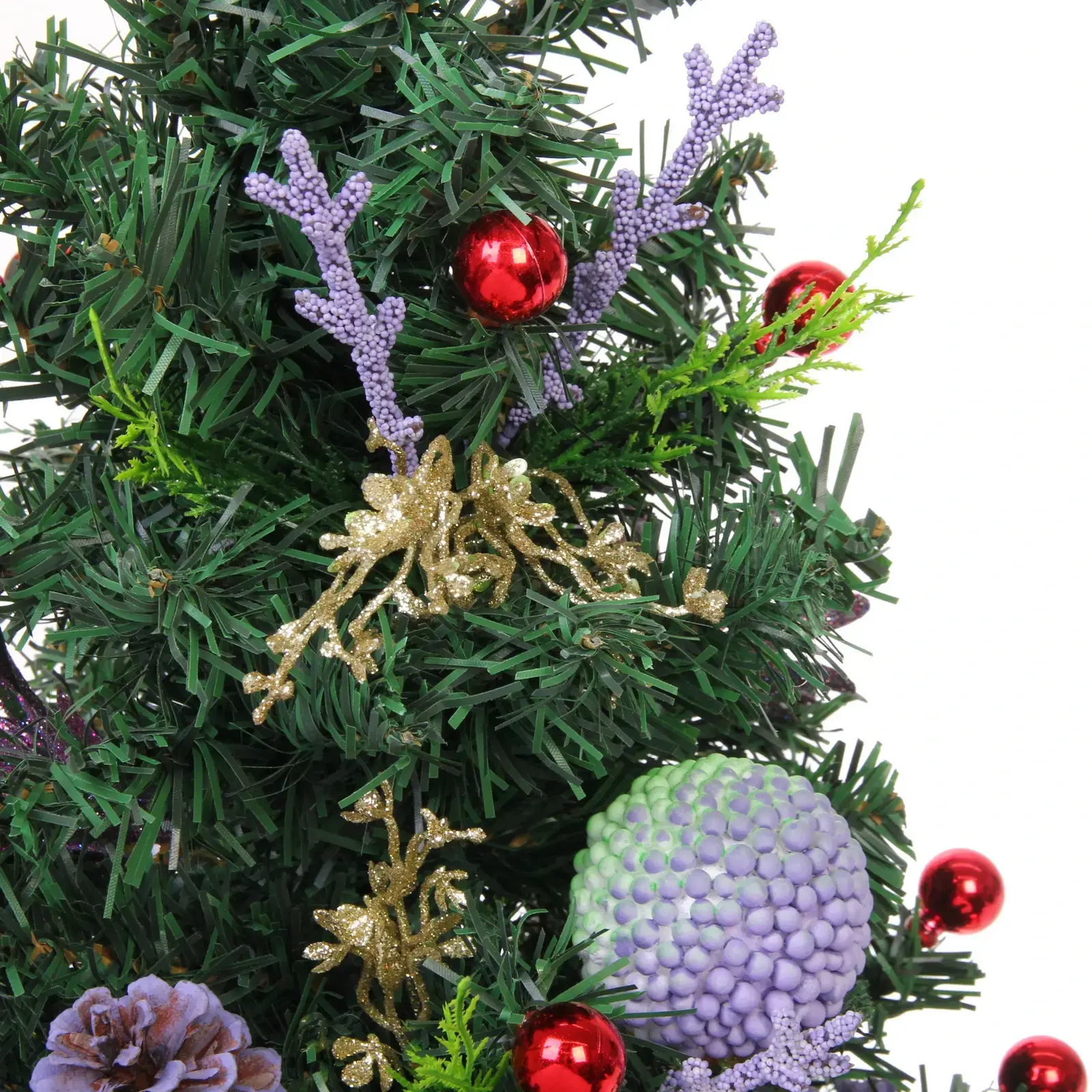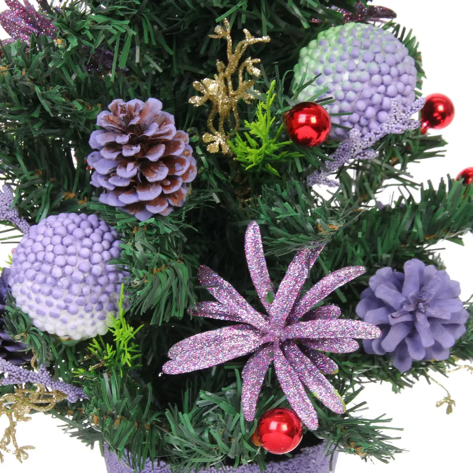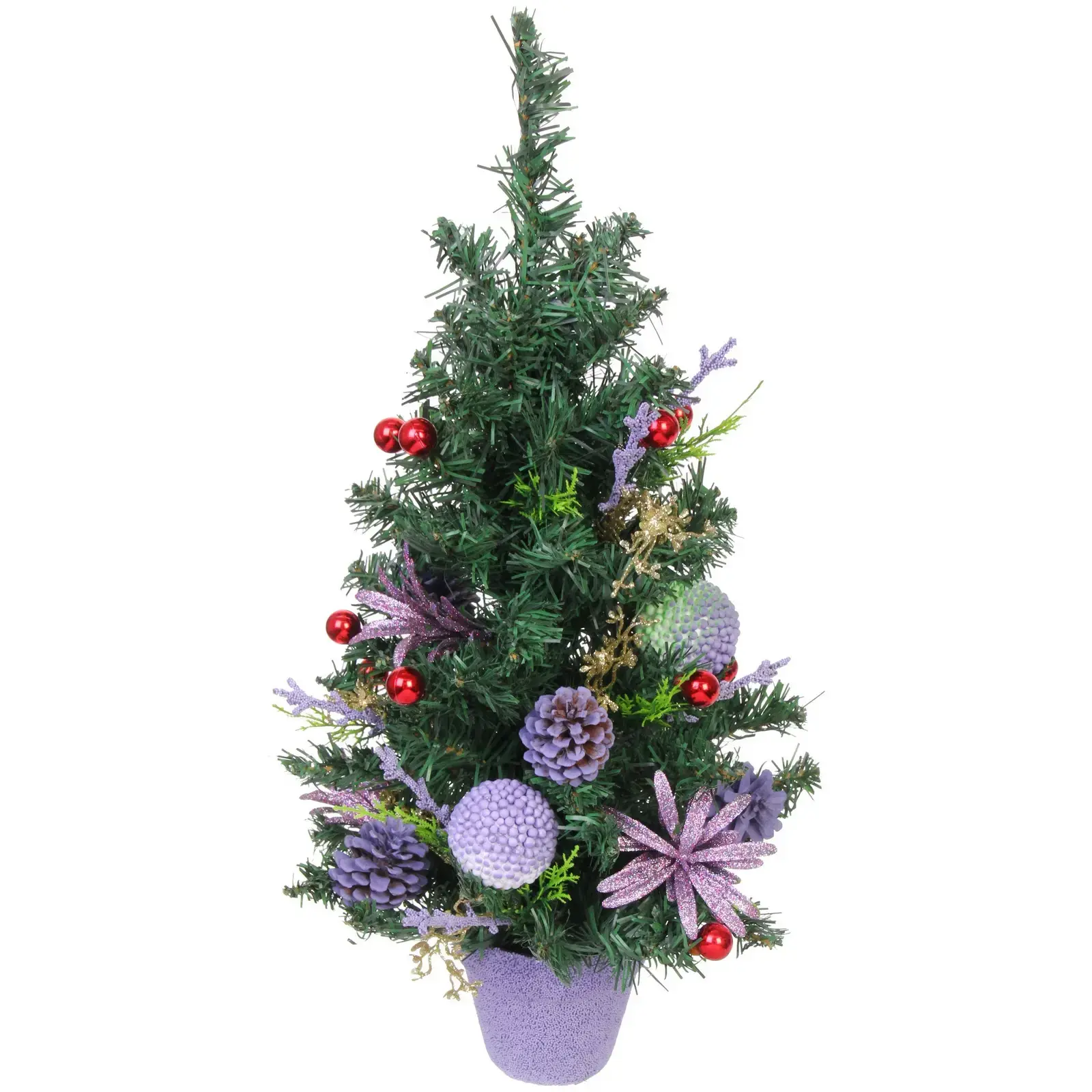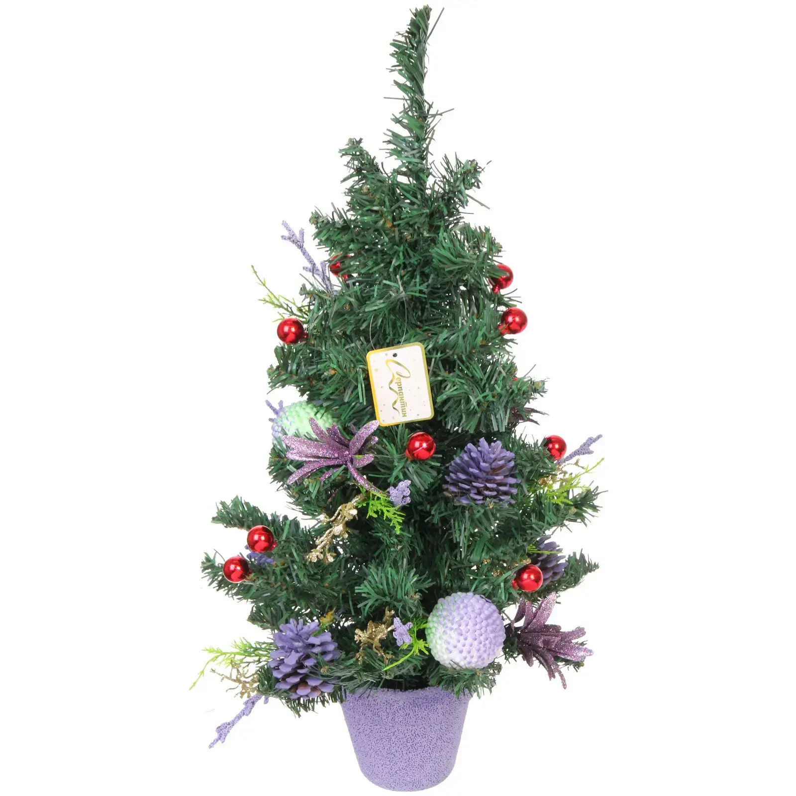 Ёлка имеет высоту 60 см и выполнена в зелёном цвете, что делает её универсальной для любого стиля оформления. Декор включает в себя пурпурные и красные ягоды, а также фиолетовые и золотые элементы, что придаёт ей праздничный вид. В основании находится горшок фиолетового цвета, который завершает общий дизайн. Эта ёлка станет отличным выбором для тех, кто ценит качество и стиль в новогоднем декоре.
