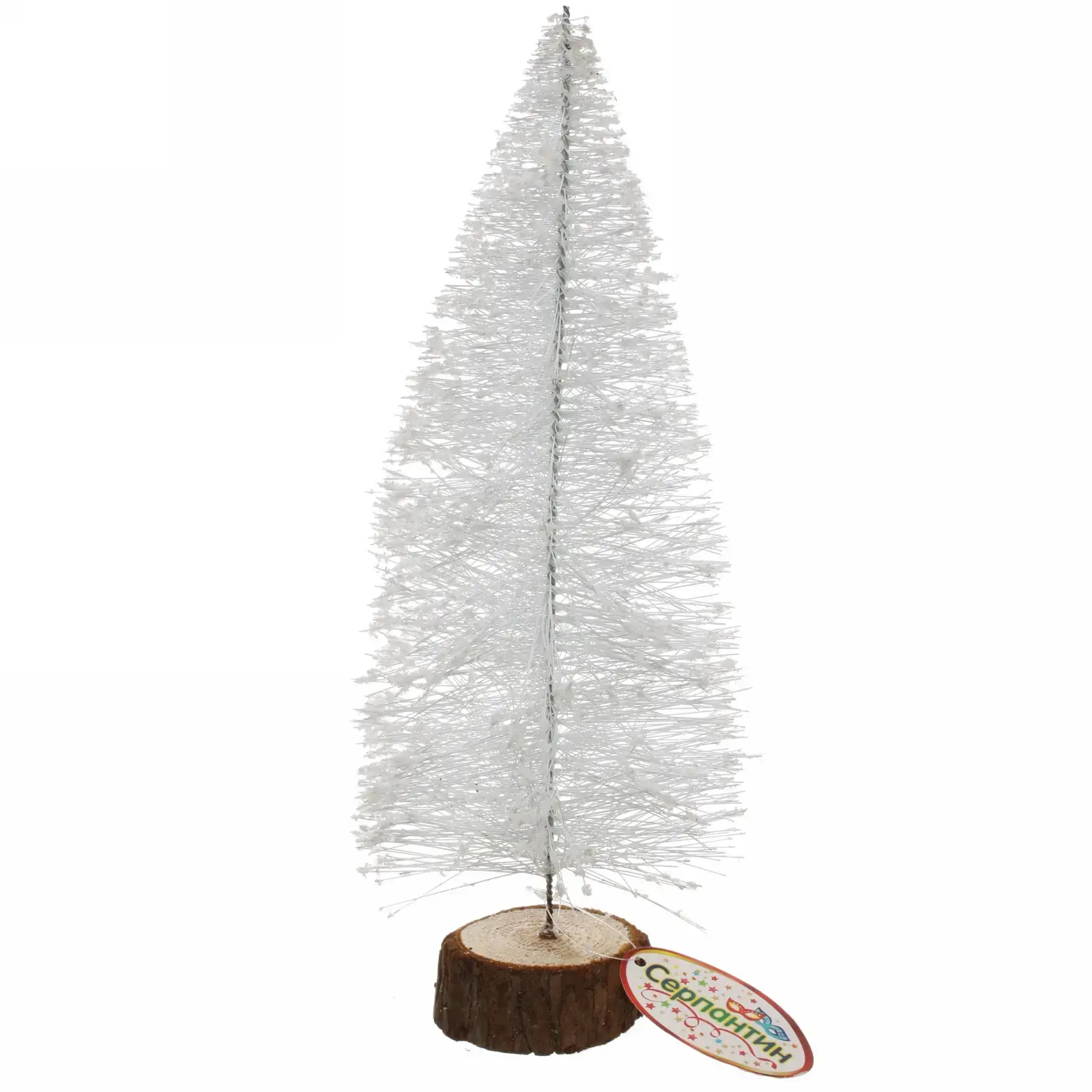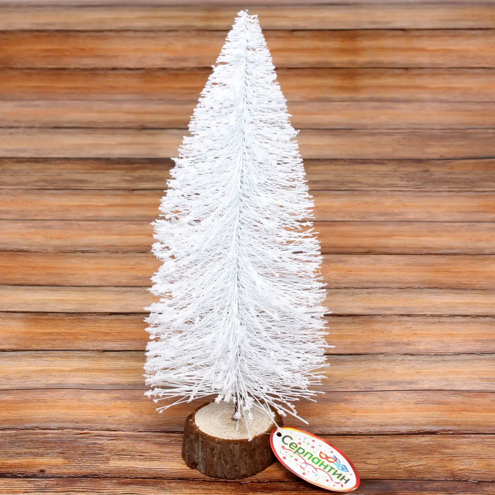Ёлка имеет высоту 27 см и располагается на круглой деревянной подставке, что обеспечивает её устойчивость. Ветки ёлки равномерно распределены, создавая эффект пушистости. Этот элемент декора станет отличным дополнением к вашему новогоднему оформлению и подарит радость вам и вашим близким.