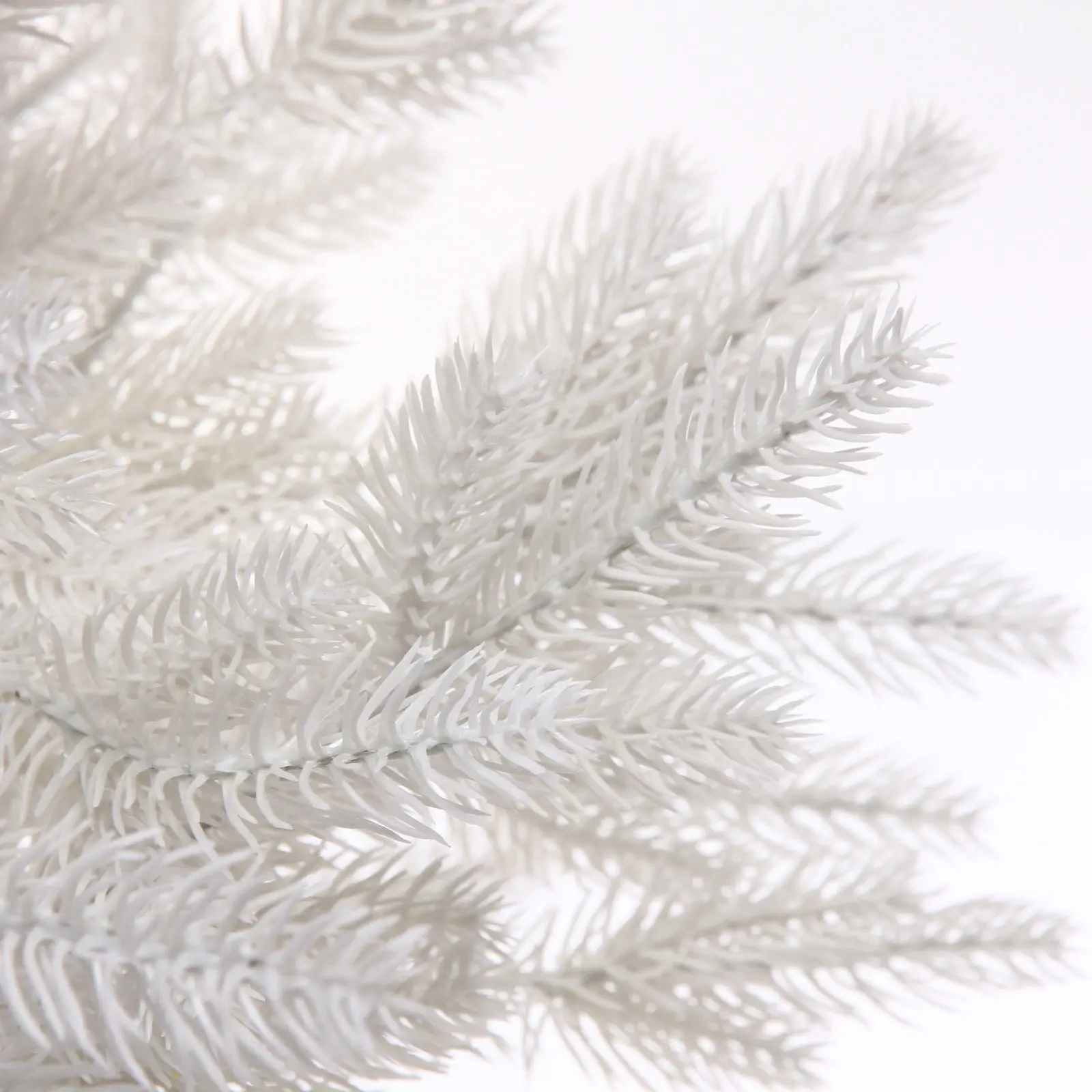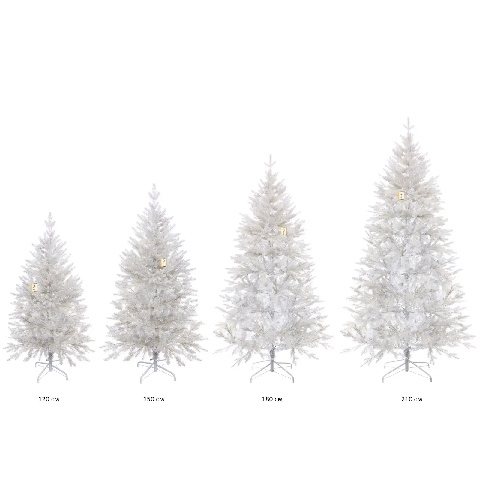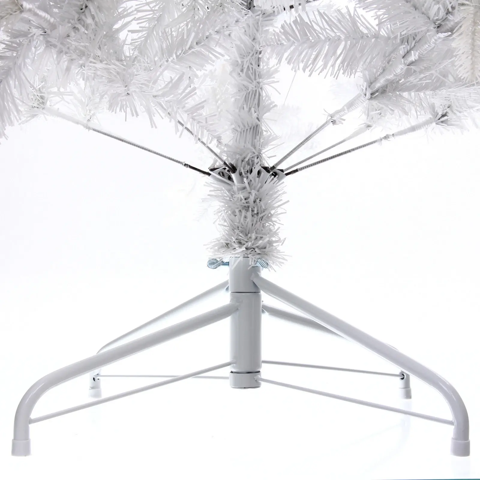 Высота – 180 см, материал веток – ПВХ и резина, количество веток – 560 шт., цвет – белый, основание выполнено из металла, покрытого белой краской. Елка легко разбирается и хранится в комплекте, занимая минимум места.