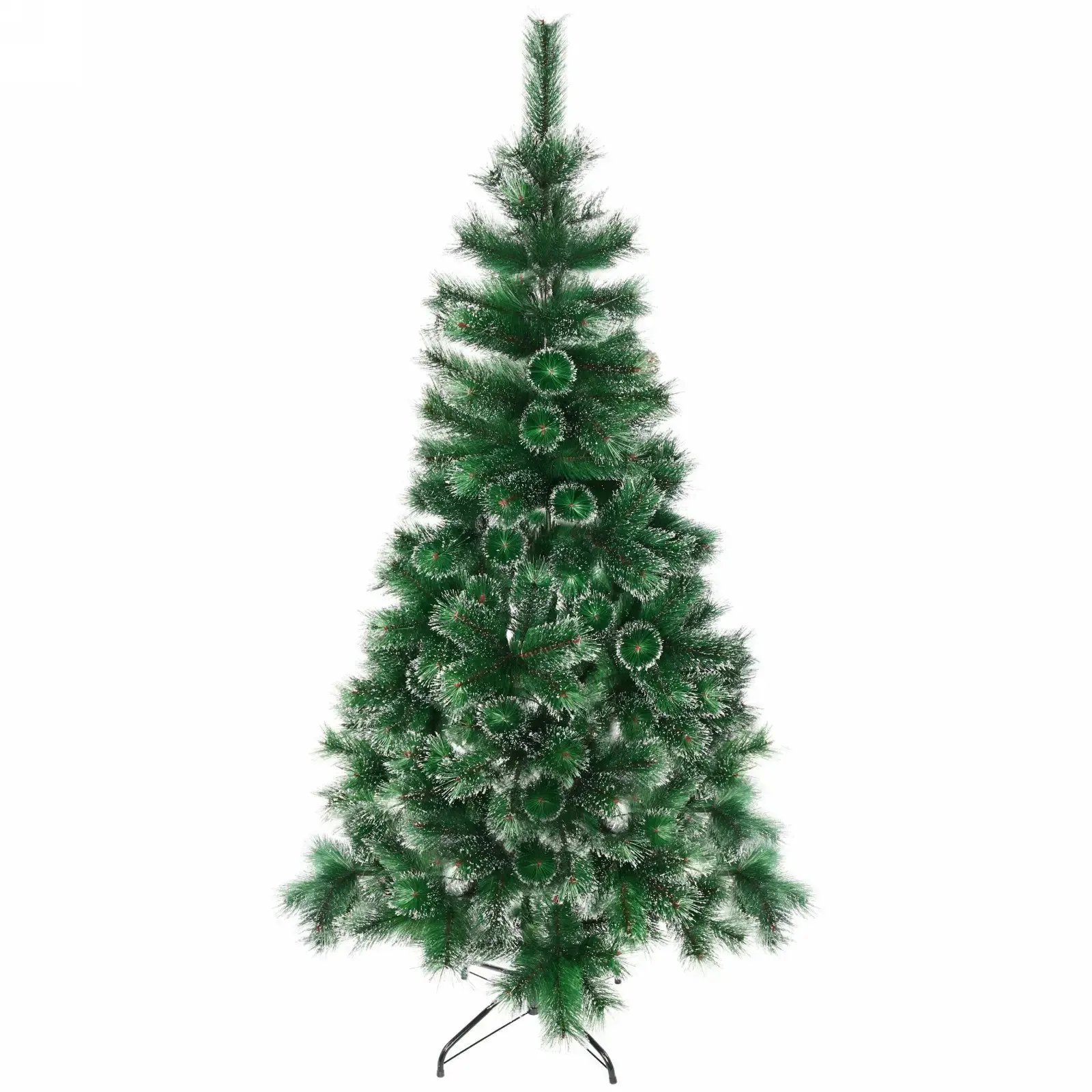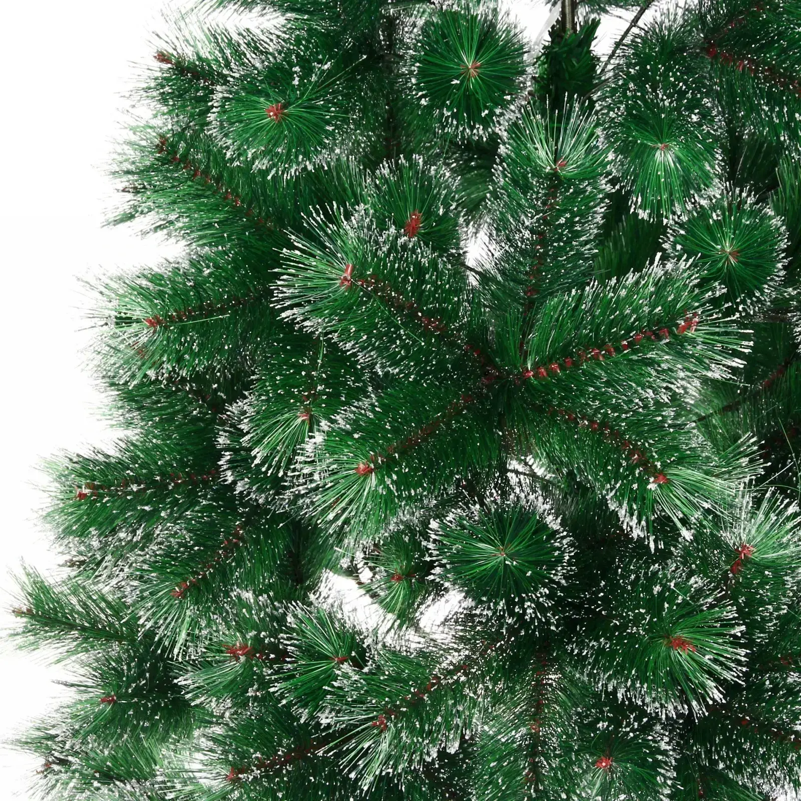 Ёлка выполнена из высококачественных материалов: металл, PVC и пластик. Высота составляет 210 см, а количество веток — 380, что обеспечивает её пышность и привлекательный внешний вид. Серебряный иней на ветках добавляет изысканности и делает ёлку ещё более эффектной. Подставка выполнена из металла, что гарантирует надёжность и устойчивость конструкции.