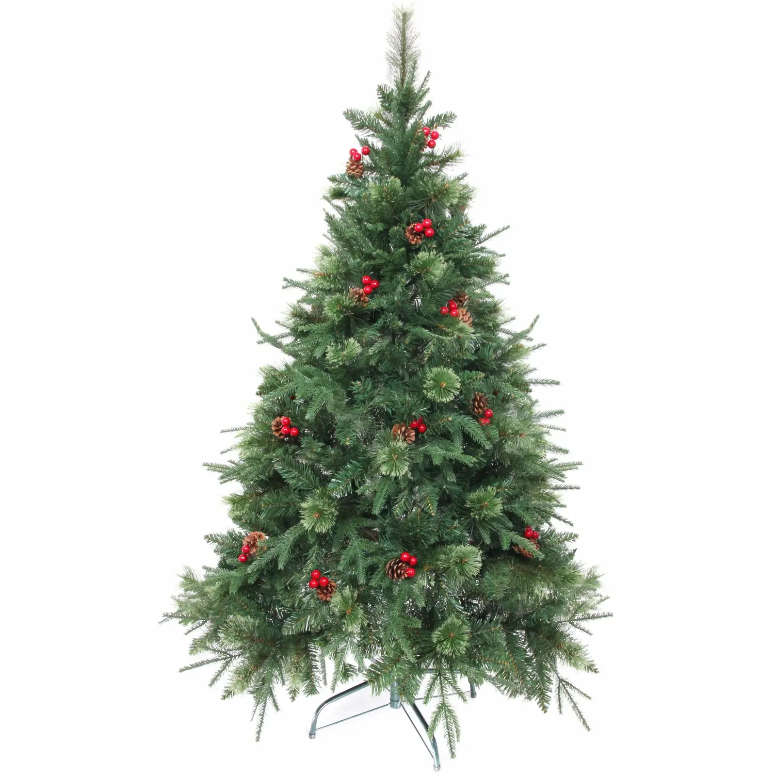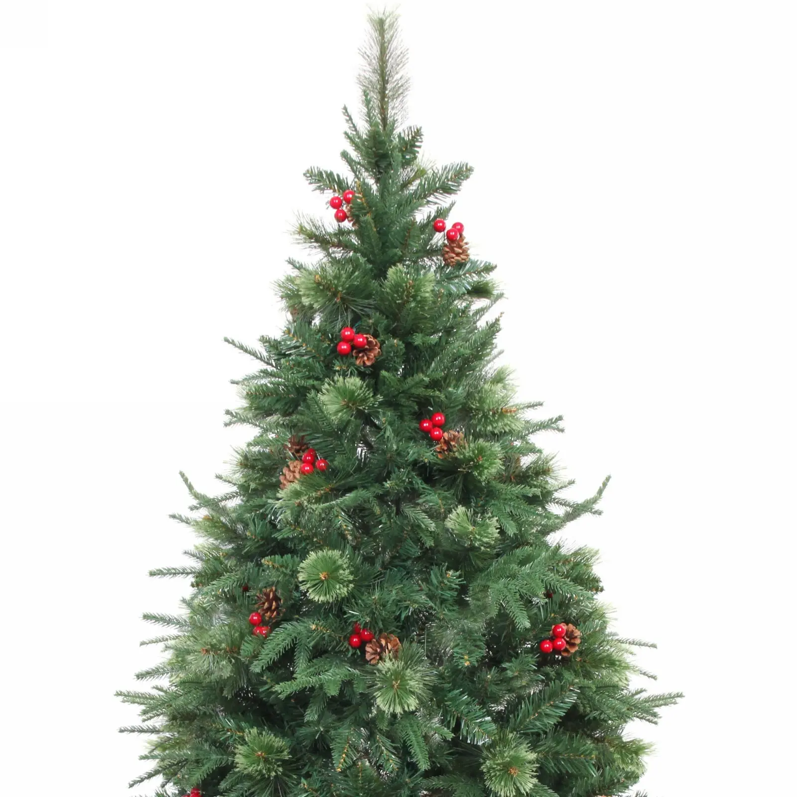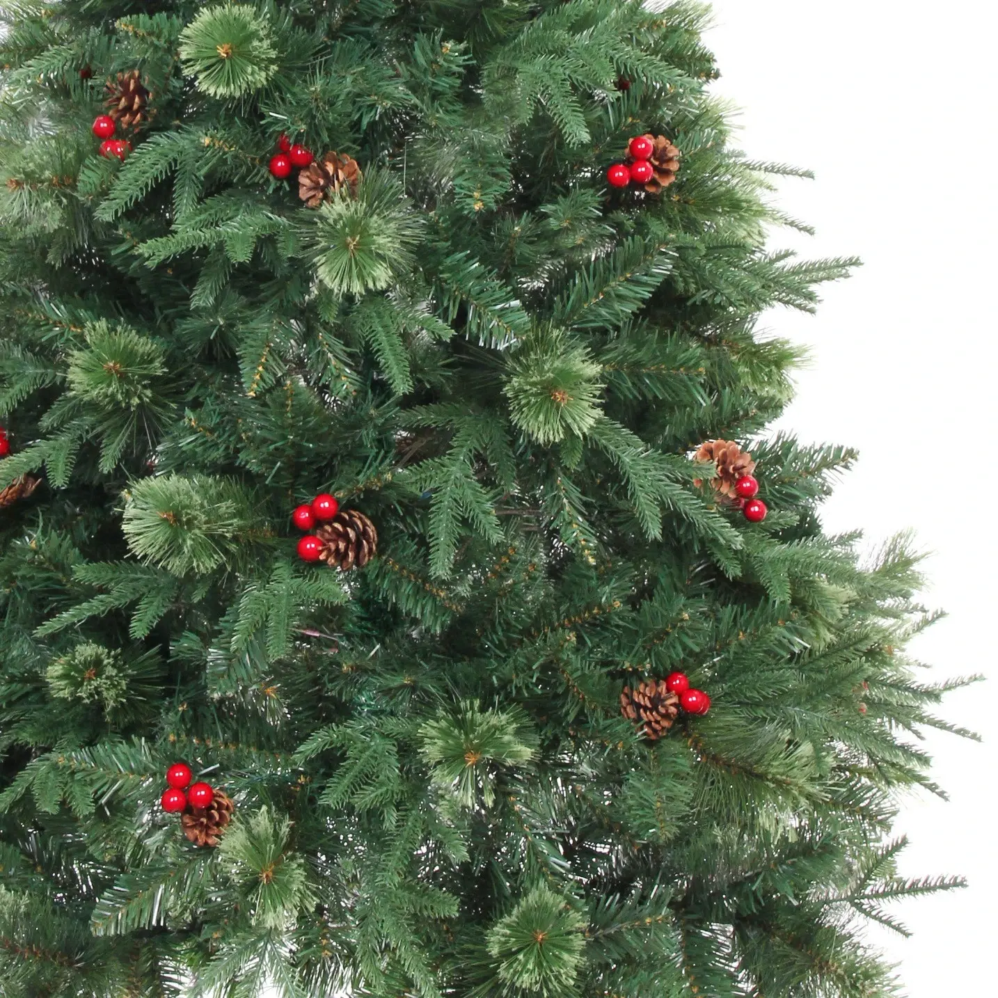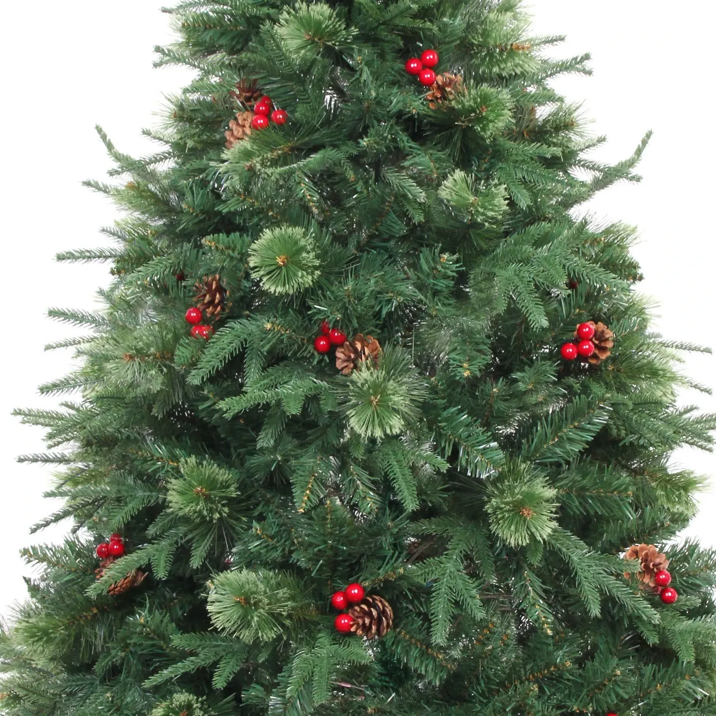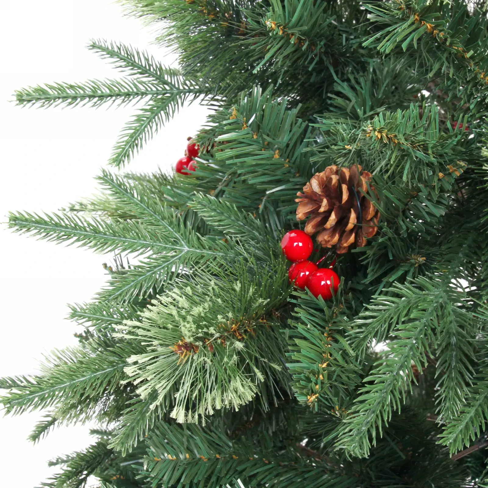 Елка выполнена из высококачественного ПВХ и металла, имеет классическую пирамидальную форму с 345 ветками, имитирующими натуральную хвойнву, украшена декоративными шишками и ягодами — всё для максимально реалистичного вида. Металлическая подставка обеспечивает устойчивость, а размеры позволяют разместить ее в большинстве помещений.