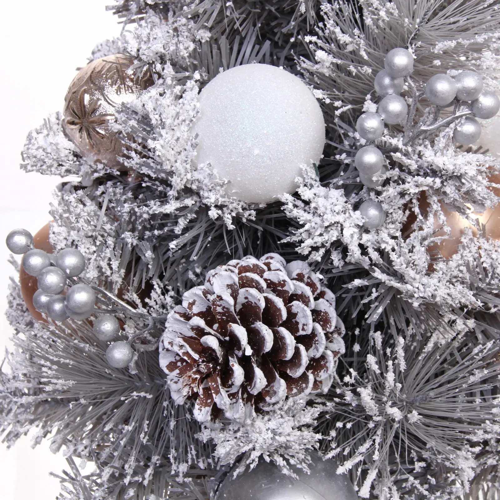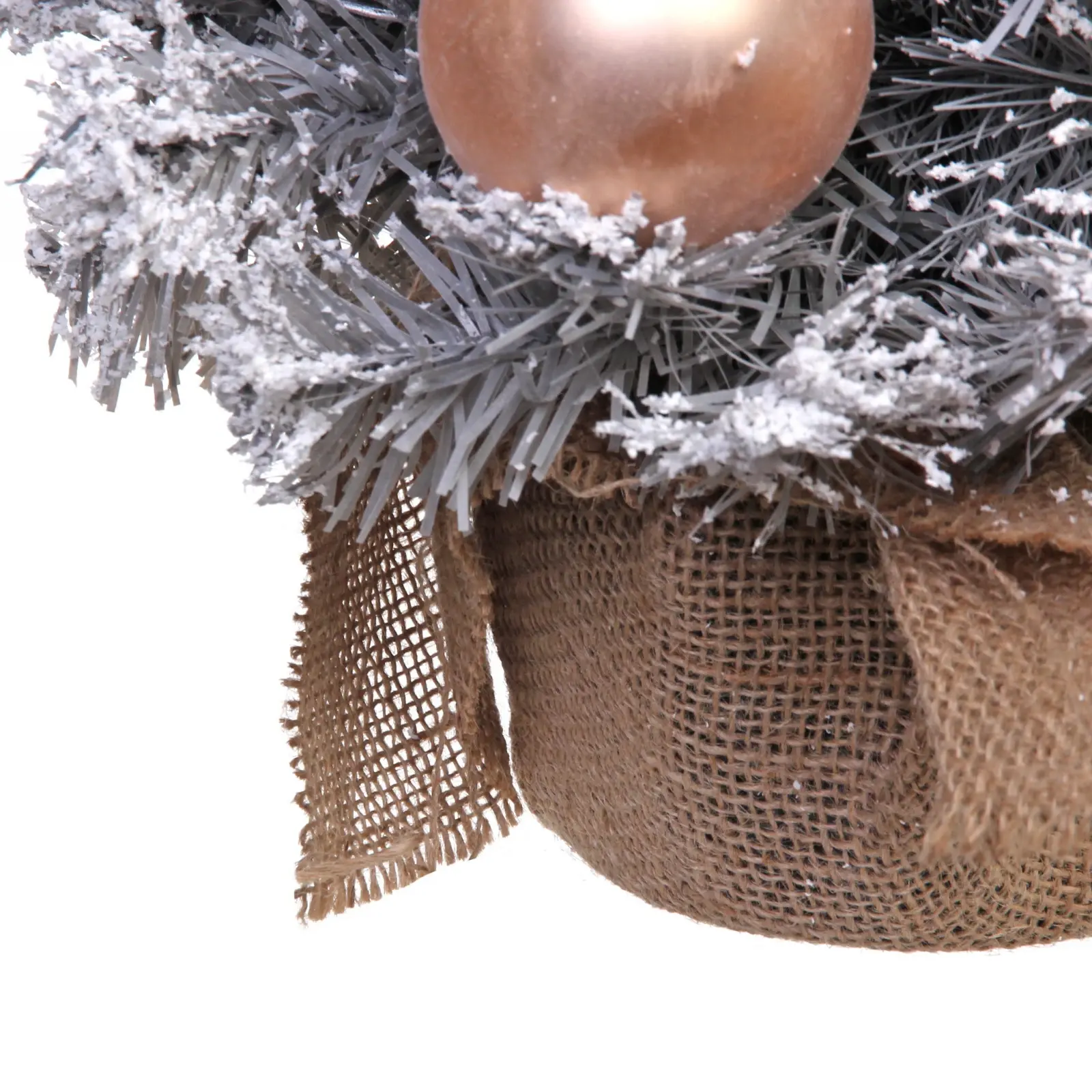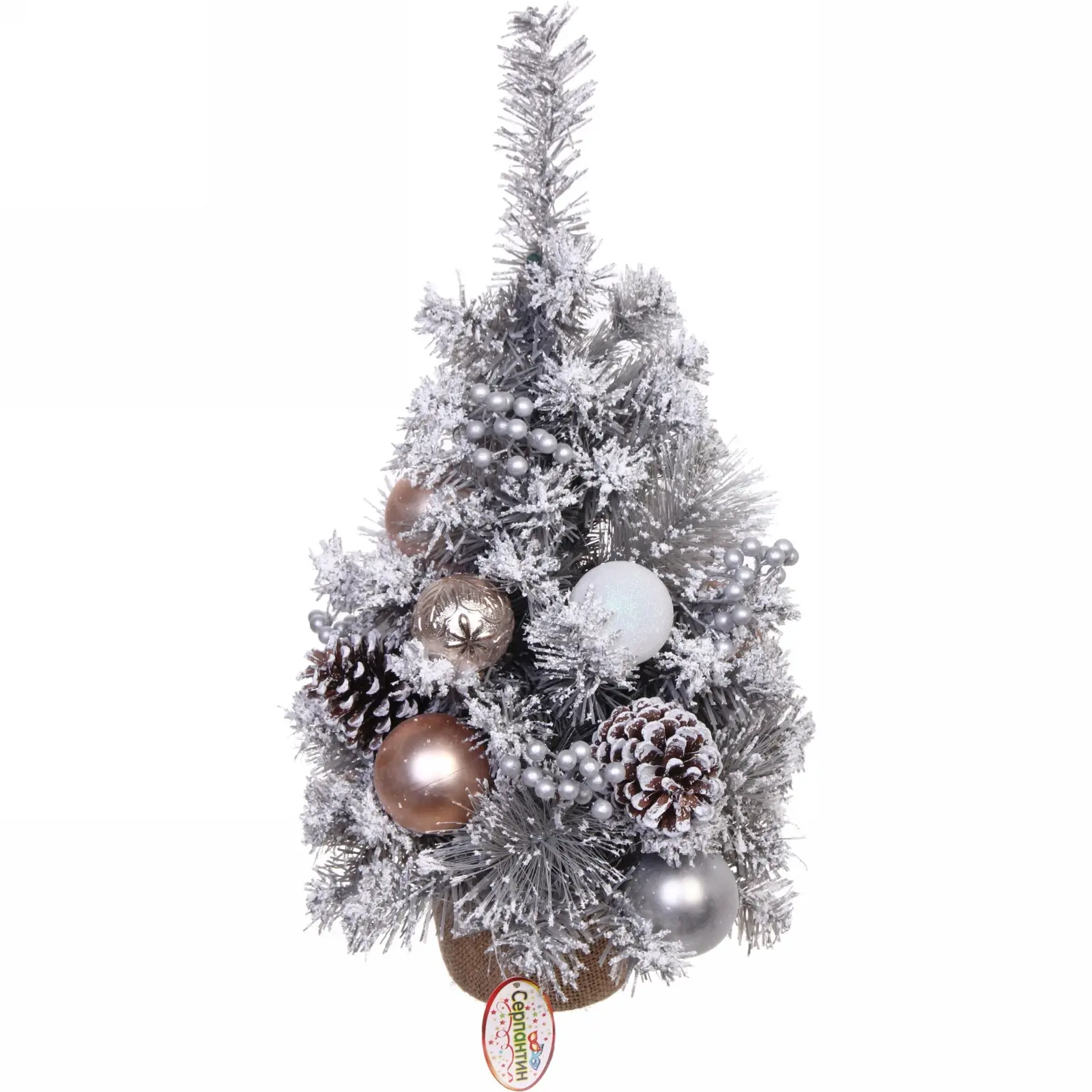 Ёлка имеет высоту 60 см и выполнена в серебристом цвете, что придаёт ей элегантный вид. Ветви украшены шишками и искусственным снегом, создающим зимнюю атмосферу. Горшок выполнен из натуральной мешковины, что добавляет натуральности и стиля. Эта ёлка станет не только украшением вашего дома, но и символом новогоднего волшебства.