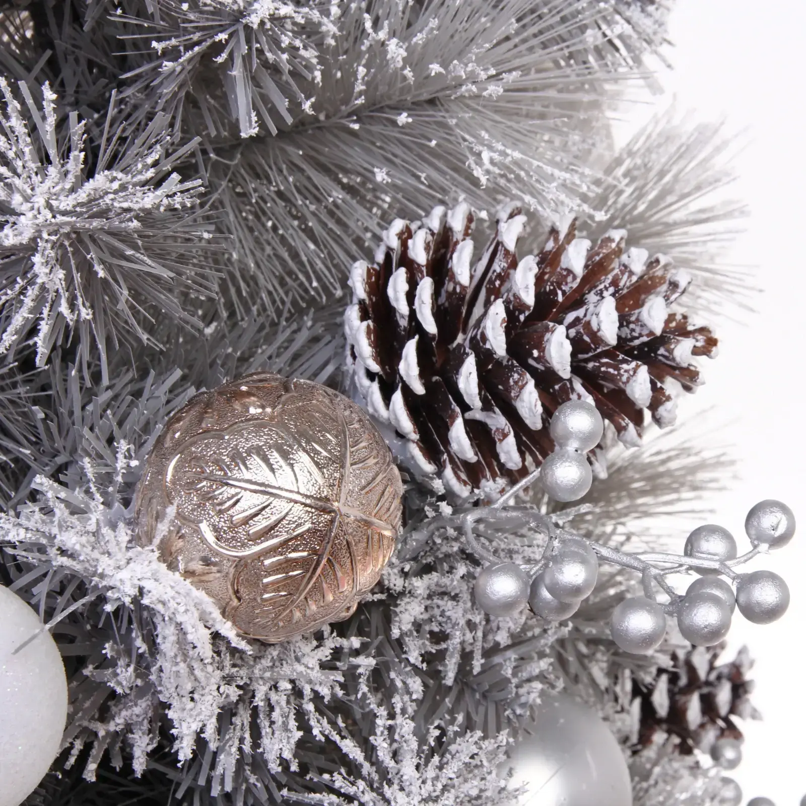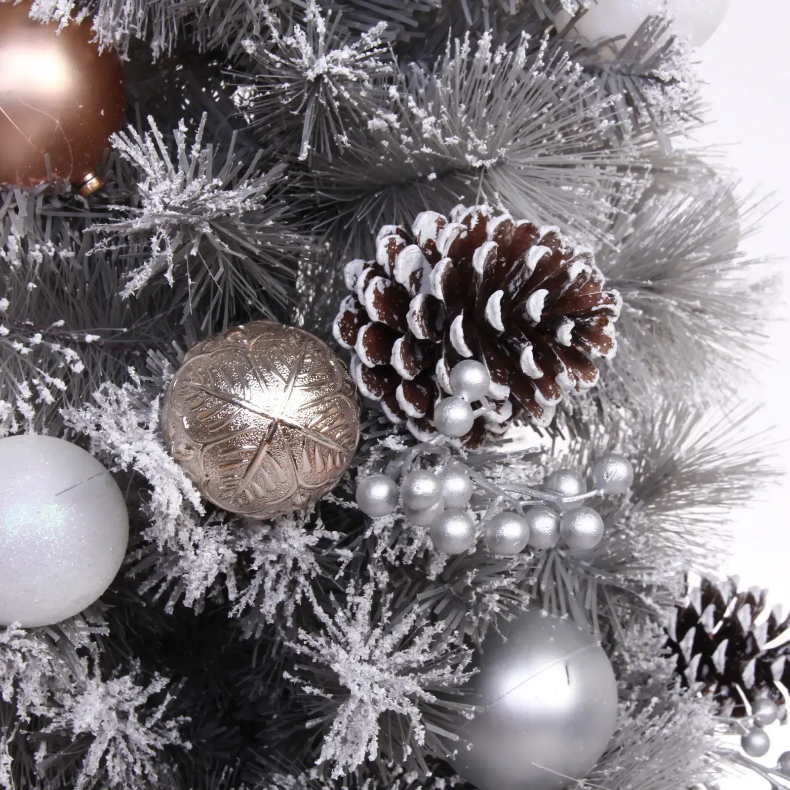 Ёлка имеет 93 ветки, что делает её особенно пушистой и объемной. Декоративные элементы включают шары различных размеров и цветов, а также шишки, которые добавляют текстуру и разнообразие. Материалы, использованные в производстве, безопасны и долговечны, что делает ёлку идеальным выбором для семей с детьми и домашними животными.