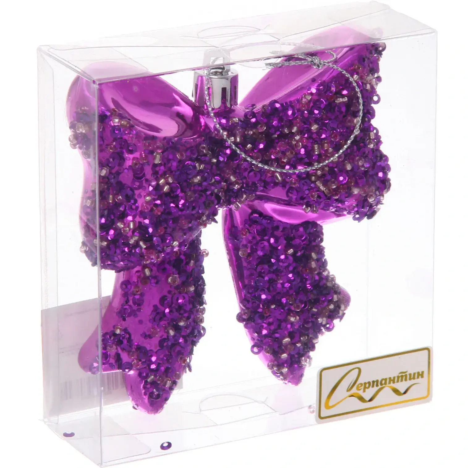 Превратите новогоднюю ёлку в сияющий шедевр с помощью стильного бантика «Бант» от бренда Серпантин. Благодаря яркому фиолетовому цвету и мерцающему покрытию, эта игрушка станет изысканным акцентом вашего праздничного декора.