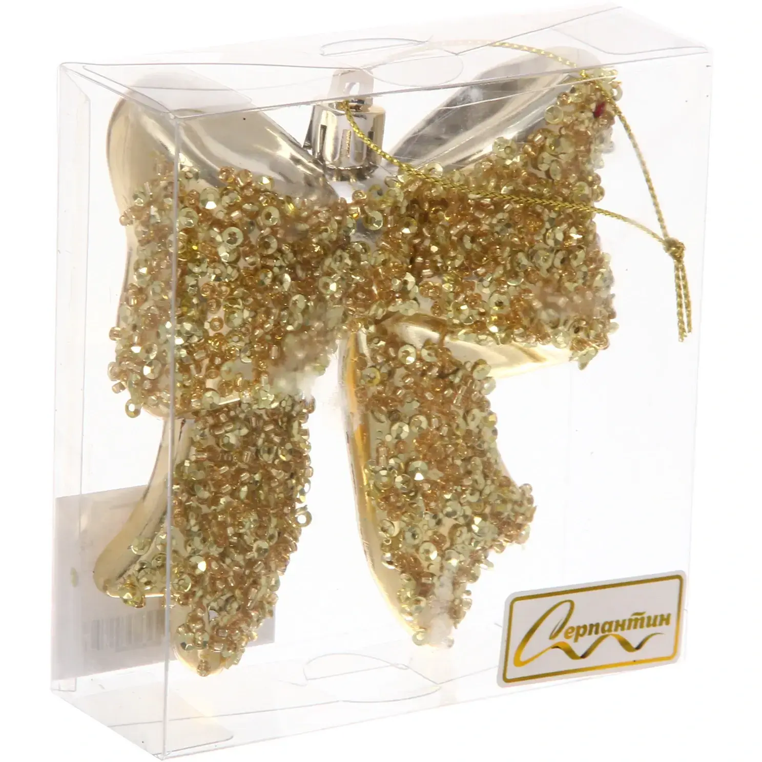 Игрушка выполнена в благородном оттенке шампань с мерцающими блёстками, которые переливаются при попадании света, создавая эффект праздничного сияния.