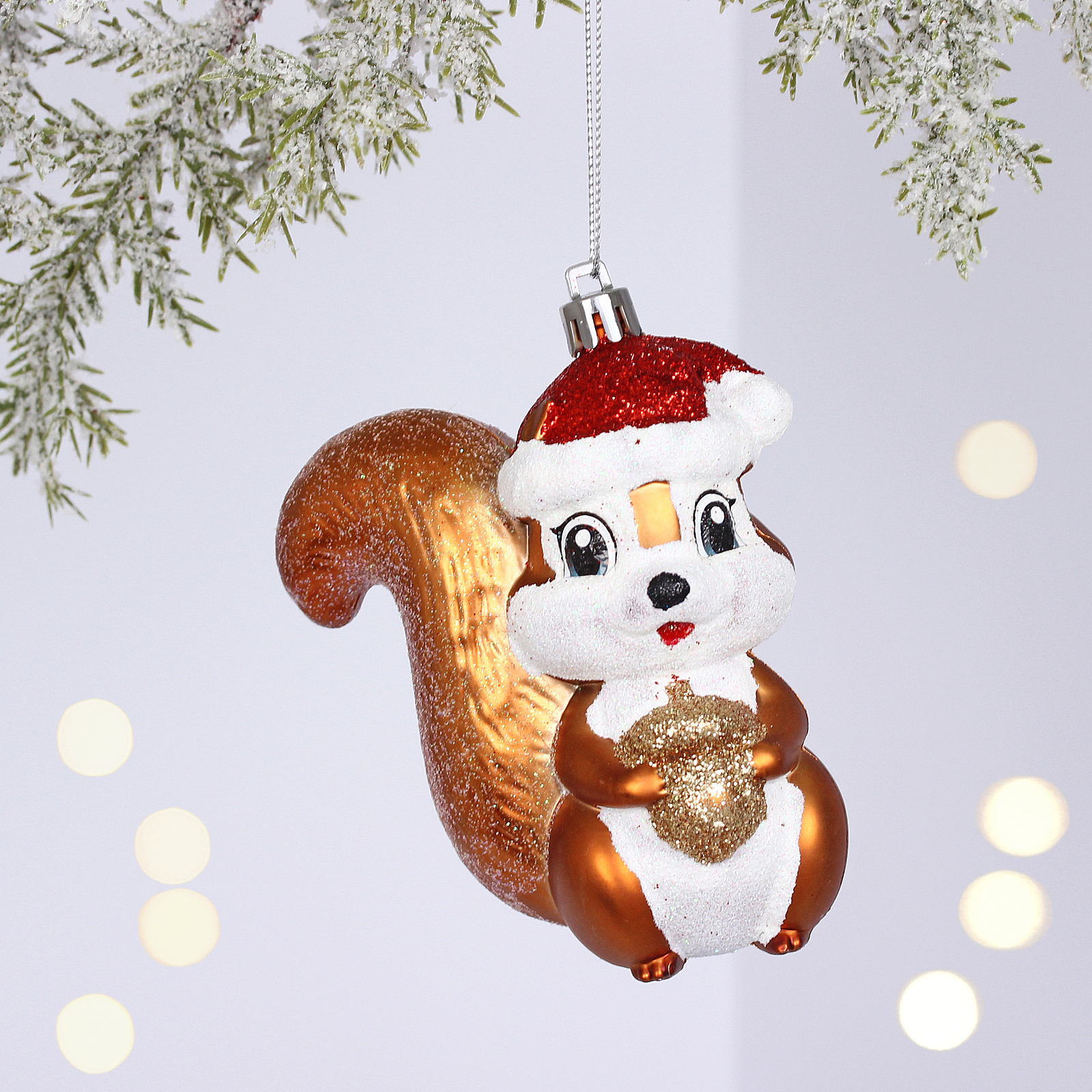 Пластиковая фигурка белочки в колпачке Санты создаст волшебную атмосферу праздника. Игрушка с золотым желудем и блестящими элементами станет центром внимания в вашем декоре.