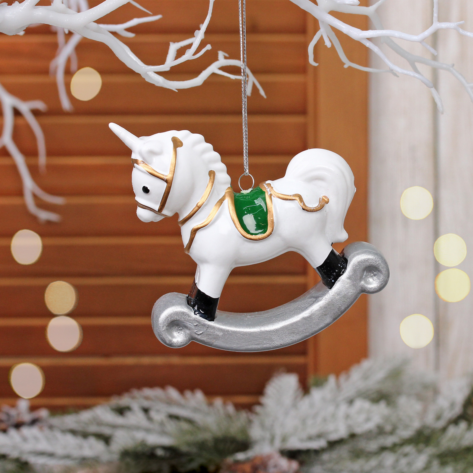 Добавьте в новогоднее оформление нотку тепла и уюта с этой изящной игрушкой. Белая лошадка-качалка с золотыми и зелёными оттенками создаёт атмосферу классического рождественского стиля, напоминая о традициях и детских воспоминаниях.