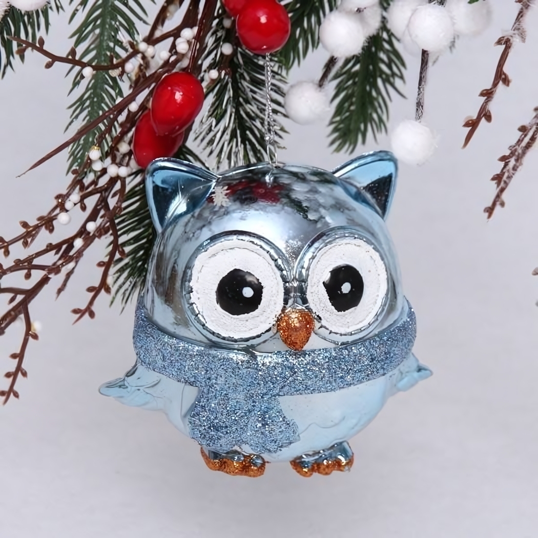 Добавьте в атмосферу новогоднего уюта и волшебства с ёлочной игрушкой 'Мудрая сова'. Эта игрушка не только украсит вашу ёлку, но и станет символом мудрости и тепла в вашем доме. Выполненная из блестящего материала, она привлекает внимание своим ярким голубым цветом и оригинальным дизайном.