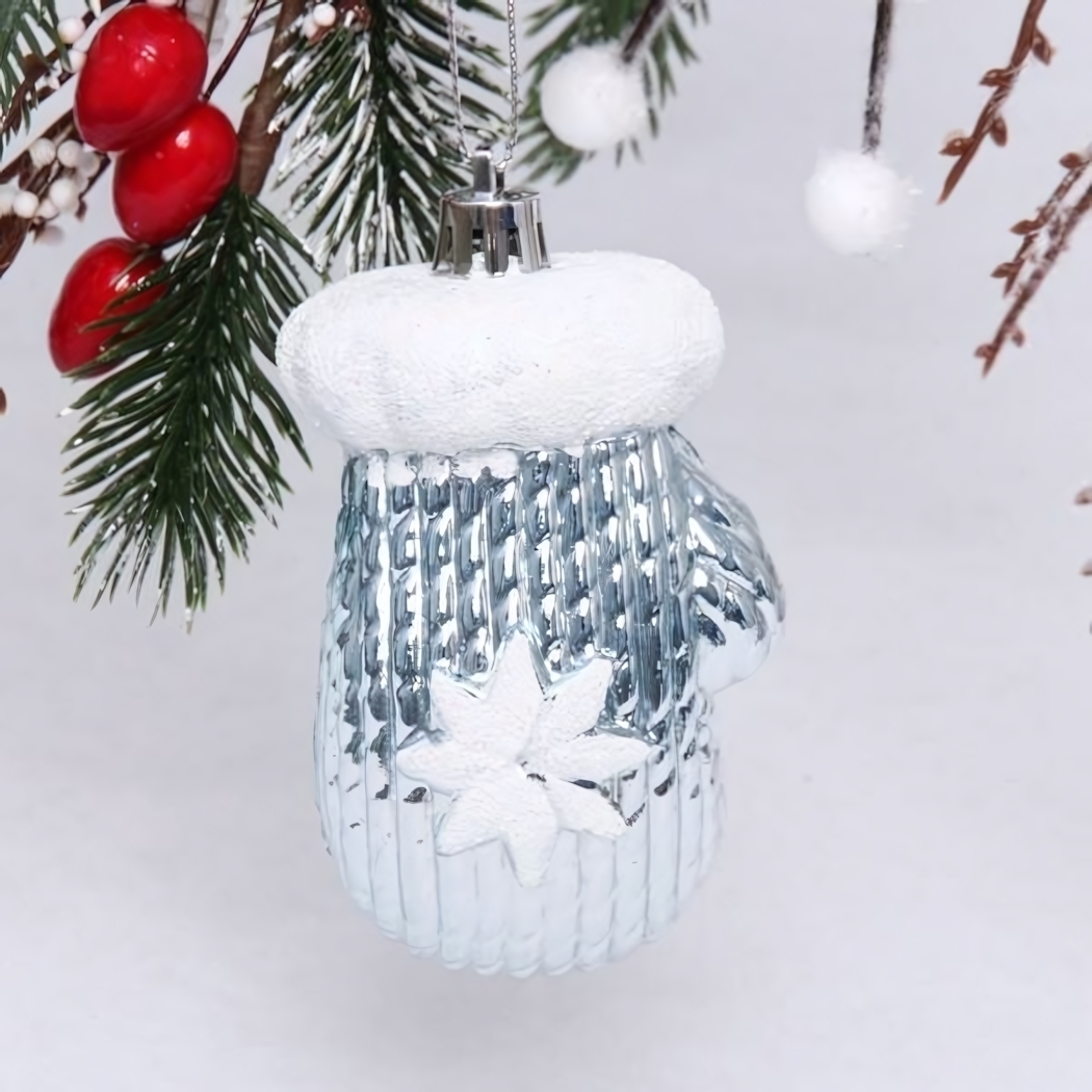 Добавьте уют и зимнее настроение вашей ёлке с помощью элегантной ёлочной игрушки в форме варежки. Серебристая поверхность с блестящим покрытием переливается в огнях гирлянд, а белый меховой отворот и снежинка создают атмосферу настоящей зимней сказки.
