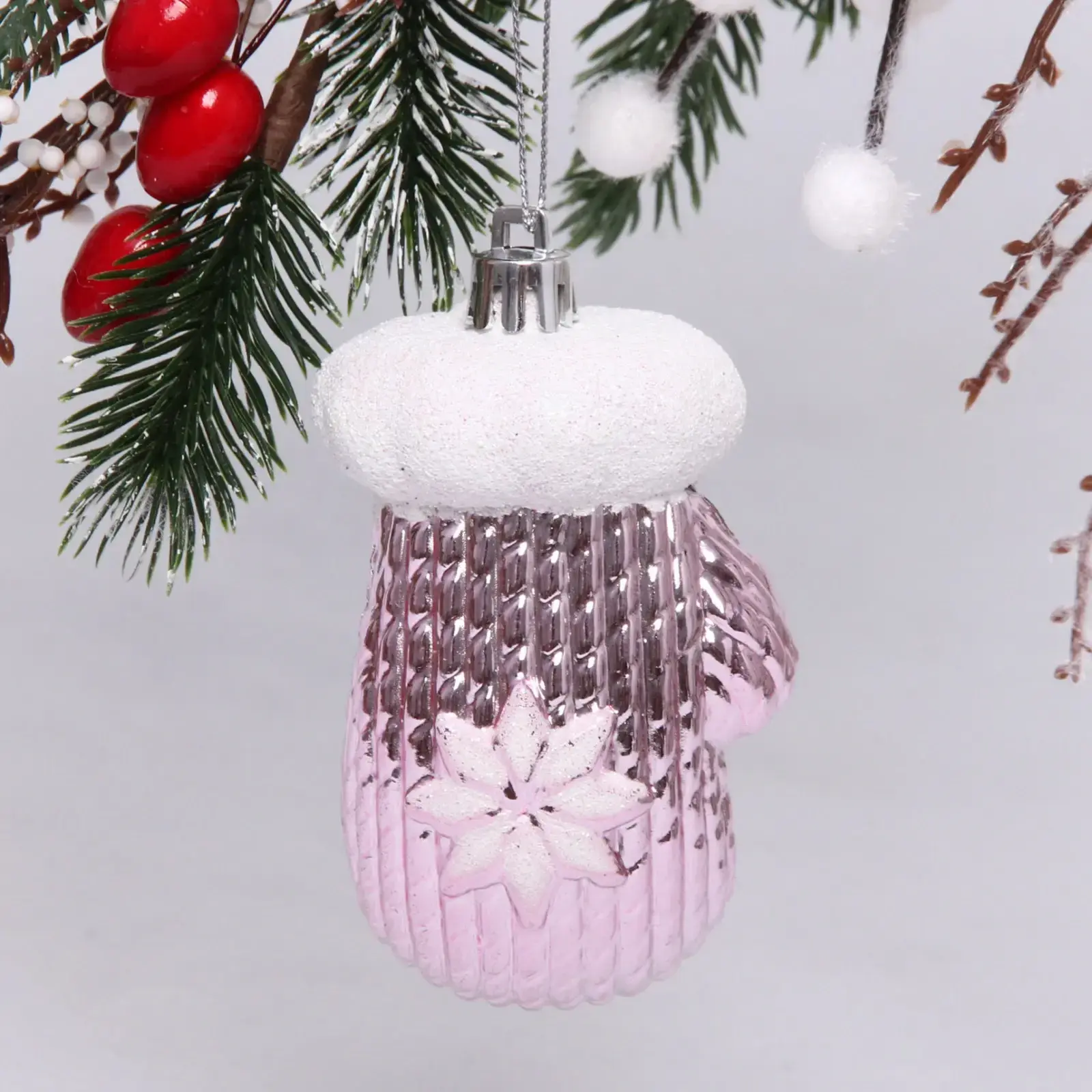 Эта очаровательная ёлочная игрушка в форме варежки добавит уют и праздничное настроение в ваш дом. Выполненная в нежном розовом цвете с белым верхом, она станет ярким акцентом на вашей новогодней ёлке. Благодаря гладкой, блестящей поверхности и рельефному дизайну, игрушка выглядит стильно и современно, привнося в интерьер атмосферу тепла и радости.