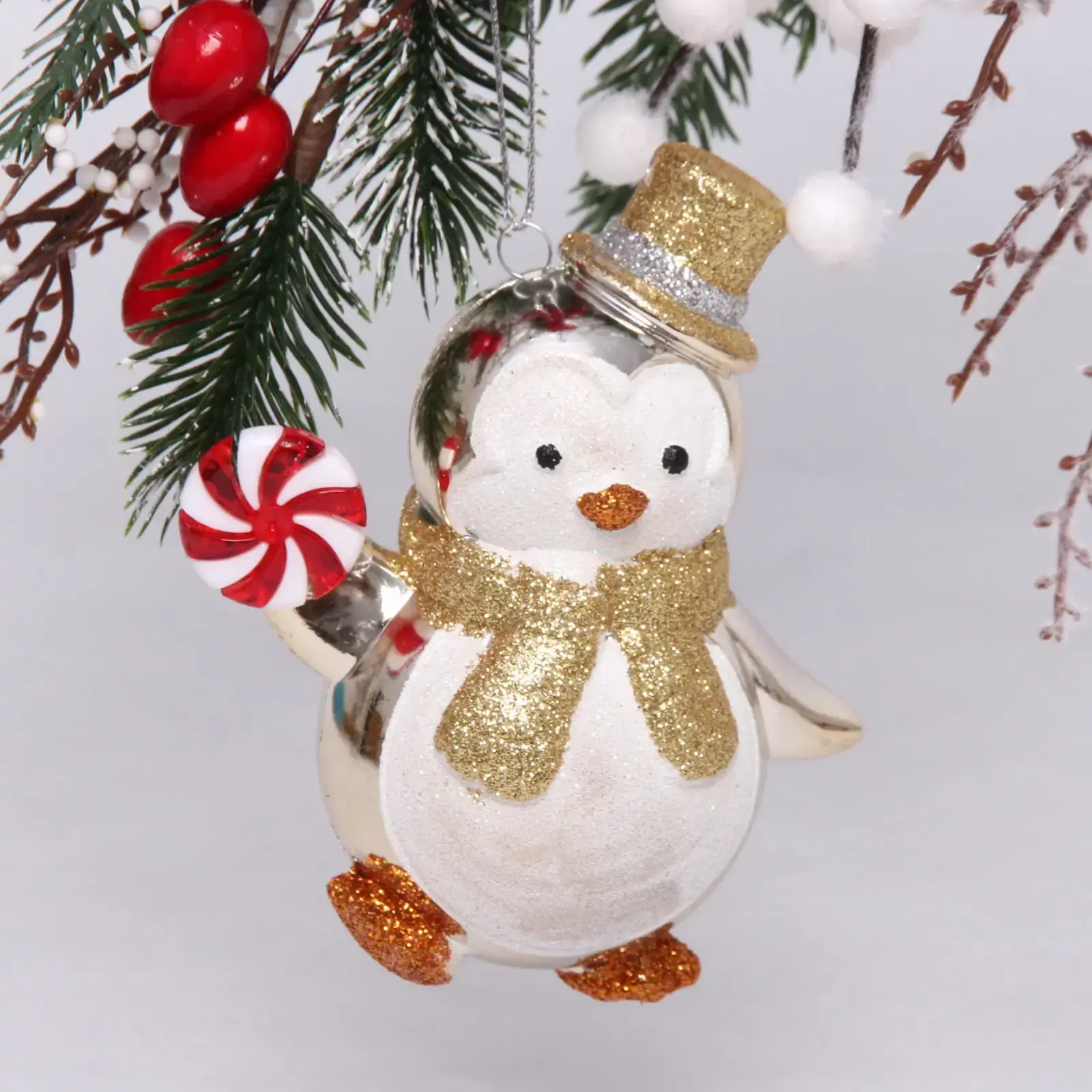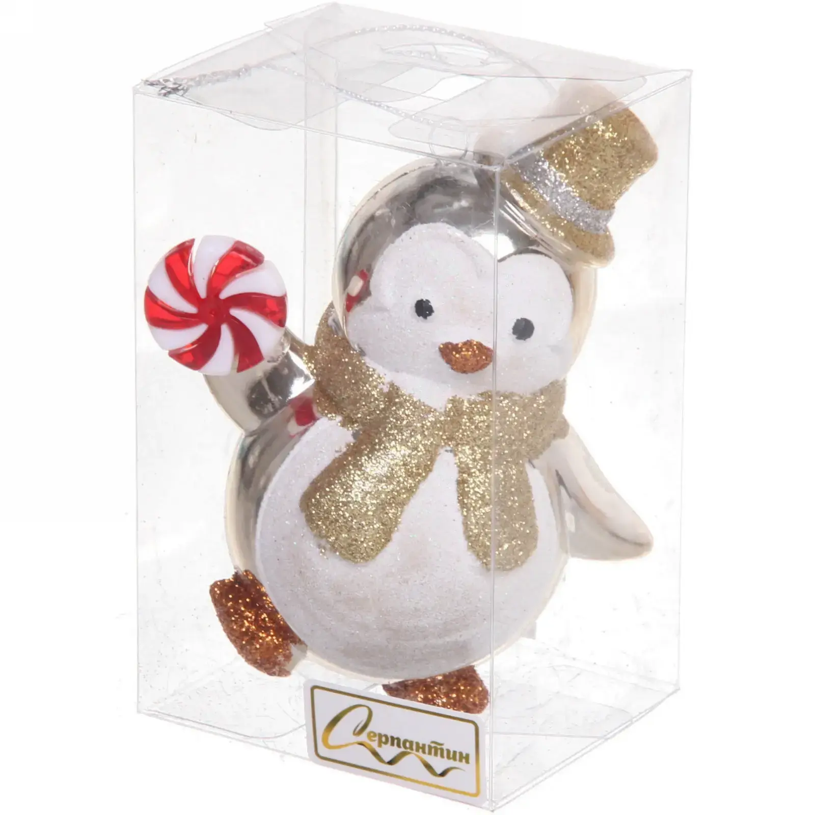 Эта ёлочная игрушка выделяется своим качественным исполнением и ярким дизайном. Пингвин одет в золотистую шляпу и шарф, украшенные блестками, что придаёт ему праздничный вид. Леденец с красными и белыми полосами добавляет игривости и веселья. Игрушка выполнена из прочного пластика, что обеспечивает её долговечность и устойчивость к повреждениям.