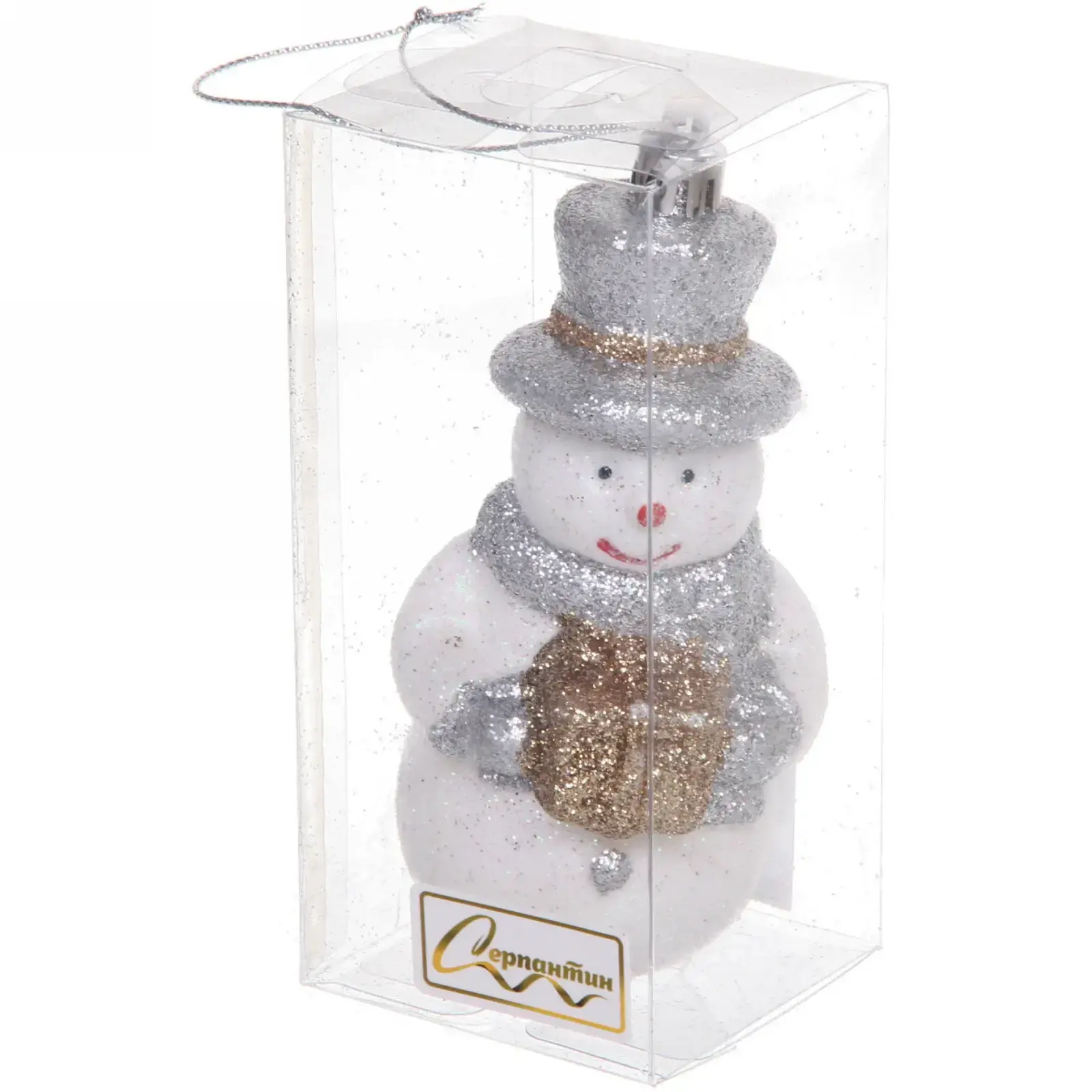 Снеговик выполнен в белом цвете с блестящей отделкой, серой шляпой и шарфом, украшенными золотистой лентой. Он также имеет красные щёки и нос в форме морковки, что придаёт ему игривый и дружелюбный вид. Игрушка упакована в прозрачную пластиковую упаковку с петлёй для подвешивания, что делает её удобной для хранения и транспортировки.